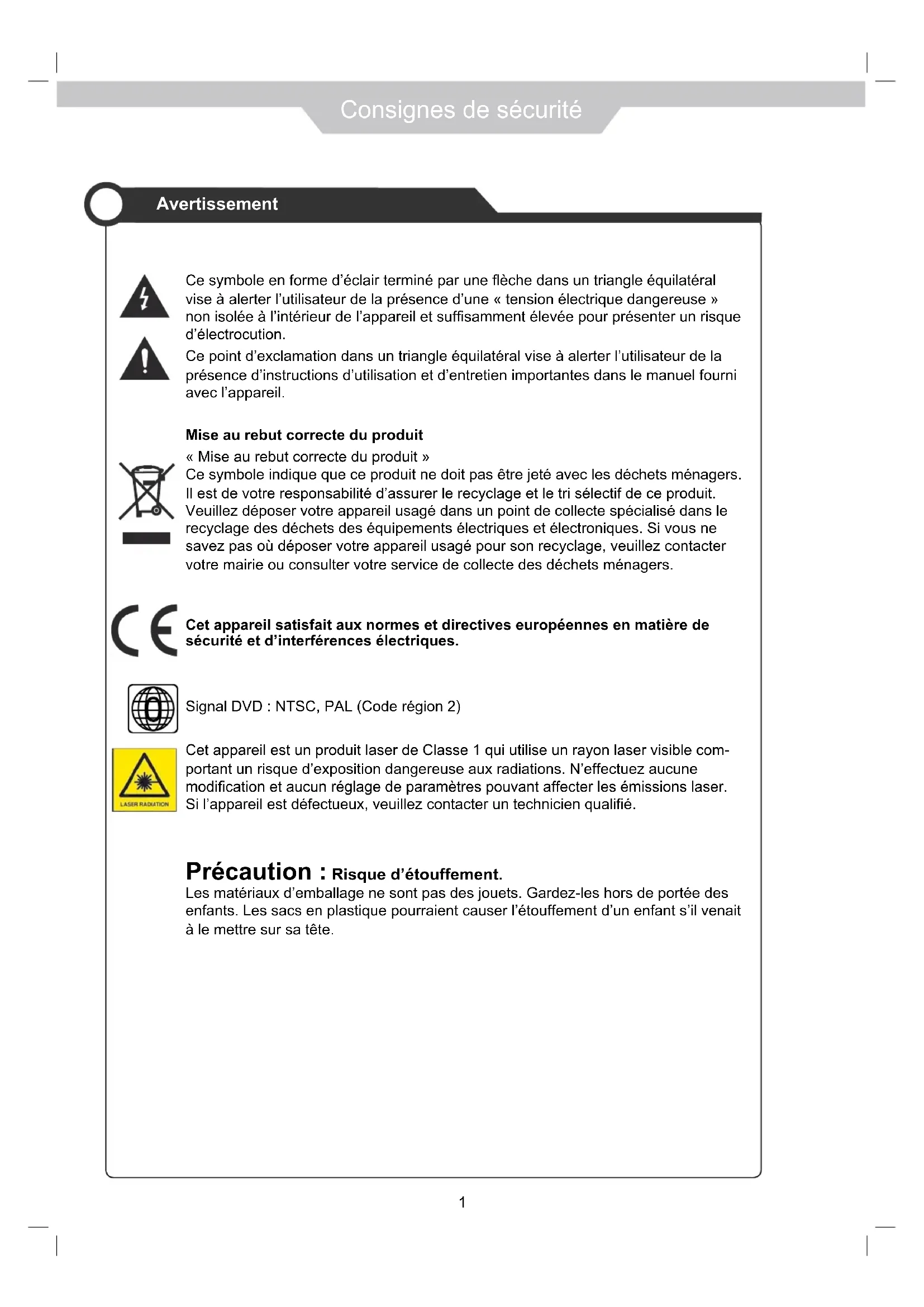 Maintenance et Service Application Utilisation de base1 Consignes de sécurité Avertissement &HV\PEROHHQIRUPHG¶pFODLUWHUPLQpSDUXQHÀqFKHGDQVXQWULDQJOHpTXLODWpUDO vise à alerter l’utilisateur de la présence d’une « tension électrique dangereuse » QRQLVROpHjO¶LQWpULHXUGHO¶DSSDUHLOHWVXI¿VDPPHQWpOHYpHSRXUSUpVHQWHUXQULVTXH d’électrocution. Ce point d’exclamation dans un triangle équilatéral vise à alerter l’utilisateur de la présence d’instructions d’utilisation et d’entretien importantes dans le manuel fourni avec l’appareil. Mise au rebut correcte du produit « Mise au rebut correcte du produit » Ce symbole indique que ce produit ne doit pas être jeté avec les déchets ménagers. Il est de votre responsabilité d’assurer le recyclage et le tri sélectif de ce produit. Veuillez déposer votre appareil usagé dans un point de collecte spécialisé dans le recyclage des déchets des équipements électriques et électroniques. Si vous ne savez pas où déposer votre appareil usagé pour son recyclage, veuillez contacter votre mairie ou consulter votre service de collecte des déchets ménagers. Cet appareil satisfait aux normes et directives européennes en matière de sécurité et d’interférences électriques. Signal DVD : NTSC, PAL (Code région 2) Cet appareil est un produit laser de Classe 1 qui utilise un rayon laser visible com- portant un risque d’exposition dangereuse aux radiations. N’effectuez aucune PRGL¿FDWLRQHWDXFXQUpJODJHGHSDUDPqWUHVSRXYDQWDIIHFWHUOHVpPLVVLRQVODVHU 6LO¶DSSDUHLOHVWGpIHFWXHX[YHXLOOH]FRQWDFWHUXQWHFKQLFLHQTXDOL¿p Précaution : Risque d’étouffement. Les matériaux d’emballage ne sont pas des jouets. Gardez-les hors de portée des enfants. Les sacs en plastique pourraient causer l’étouffement d’un enfant s’il venait à le mettre sur sa tête.2 Consignes de sécurité Conseils de sécurité $¿QG¶XWLOLVHUO¶DSSDUHLOHQWRXWHVpFXULWpHWGHSUR¿WHUSOHLQHPHQWGHVHVIRQFWLRQVYHXLOOH] lire attentivement toutes les instructions de ce manuel d’utilisation, notamment les consignes de sécurité ci-dessous. Sécurité électrique &HWpOpYLVHXUGRLWXQLTXHPHQWrWUHEUDQFKpVXUXQHSULVHGHFRXUDQWUpSRQGDQWDX[VSpFL¿- FDWLRQV¿JXUDQWVXUO¶pWLTXHWWHVLWXpHjO¶DUULqUHGXWpOpYLVHXU $¿QG¶pYLWHUWRXWULVTXHGHVXUFKDUJHQHEUDQFKH]SDVXQWURSJUDQGQRPEUHG¶DSSDUHLOV sur la même prise de courant que le téléviseur. - Placez les câbles de connexion de façon à ne pas marcher ni trébucher dessus. 1HSRVH]SDVG¶REMHWVORXUGVVXUOHVFkEOHVRXOHXUV¿FKHVD¿QGHQHSDVOHVHQGRP