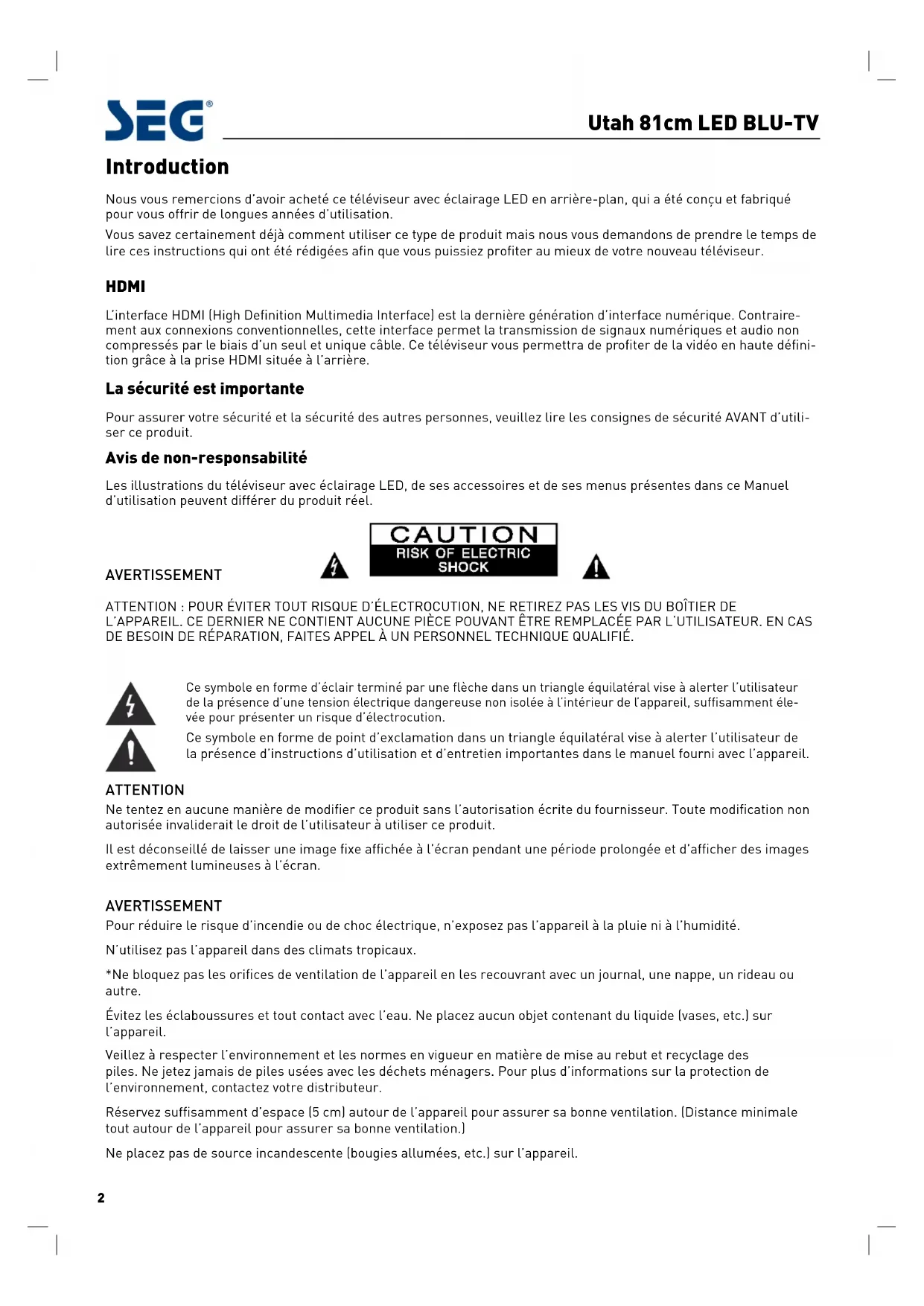 - Utah 81cm LED BLU-TV Table de Matières Introduction p. 2