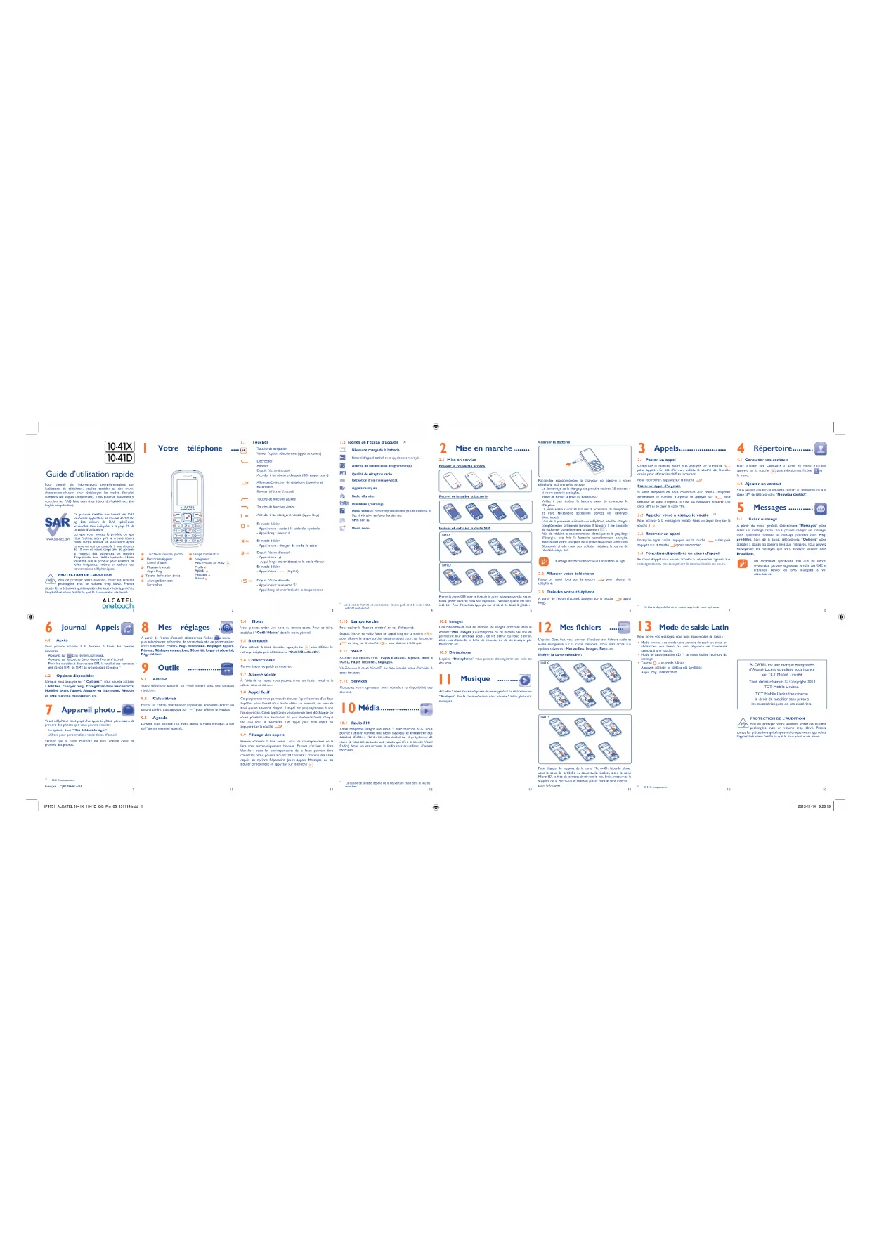Vérifiez que le récepteur, le connecteur et le haut-parleur • de votre téléphone sont propres. Je ne peux pas utiliser certaines fonctions décrites dans le manuel Vérifiez la disponibilité de ce service dans votre abonnement • auprès de votre opérateur. Vérifiez si cette fonction ne nécessite pas l’utilisation d’un • accessoire ALCATEL ONE TOUCH. Aucun numéro n’est composé lorsque je sélectionne un numéro dans mon répertoire Vérifiez que vous avez correctement enregistré ce numéro.• Veuillez vérifier que vous avez bien saisi l'indicatif pays si • vous appelez l'étranger. Je ne peux plus ajouter de contacts dans mon répertoire Vérifiez que le répertoire de votre carte SIM n’est pas • plein ; supprimez des fichiers ou enregistrez-les dans le répertoire du téléphone Mes correspondants ne peuvent pas laisser de message sur mon répondeur Vérifiez la disponibilité de ce service auprès de votre • opérateur. Je ne peux pas accéder à mon répondeur Vérifiez que le numéro du répondeur de votre opérateur est bien • enregistré dans “Messages\Messagerie vocale”. Essayez plus tard si le réseau est occupé.• Précautions d’emploi ...... Avant d’utiliser votre téléphone, lisez ce chapitre avec attention. Le fabricant ne pourra être tenu responsable des conséquences résultant d’une utilisation impropre et/ou non conforme aux instructions contenues dans le manuel.• SECURITE EN VEHICULE : Compte tenu des études qui démontrent que l’usage d’un téléphone mobile lors de la conduite d’un véhicule représente un facteur réel de risque, même lorsqu’il est associé à un dispositif mains-libres (car kit, casque à écouteurs...), le conducteur doit s’abstenir de toute utilisation de son téléphone tant que le véhicule n’est pas à l’arrêt.Lorsque vous conduisez, abstenez-vous d’utiliser votre téléphone ou même votre kit piéton pour téléphoner ou écouter de la musique. L’utilisation de ces équipements présente un danger et est susceptible d’être sanctionnée par la loi dans certaines régions. Votre téléphone sous tension émet des rayonnements qui peuvent perturber l’électronique de bord de votre véhicule, tels que les systèmes anti-blocage de freins (“ABS”), les coussins de sécurité (“Airbag”), etc. En conséquence, il vous appartient de :- ne pas poser votre téléphone sur le tableau de bord ou dans une zone de déploiement de l’Airbag,- vous assurer auprès du constructeur automobile ou de son revendeur de la bonne isolation de l’électronique de bord.• CONDITIONS D’UTILISATION :Il est conseillé d’éteindre de temps à autre le téléphone afin d’optimiser ses performances.Veillez à éteindre votre téléphone dans un avion, ou à paramétrer votre poste en “Mode avion”.Veillez à éteindre votre téléphone en milieu hospitalier, sauf dans les zones éventuellement réservées à cet effet. Comme d’autres types d’équipements courants, les téléphones mobiles peuvent perturber le fonctionnement de dispositifs électriques, électroniques ou utilisant des radiofréquences.Veillez à éteindre votre téléphone à proximité de gaz ou de liquides inflammables. Respectez les règles d’utilisation affichées dans les dépôts de carburants, les stations service, les usines chimiques et sur tous les sites où des risques d’explosion pourraient exister.Lorsque le téléphone est sous tension, veillez à ce qu’il ne se trouve jamais à moins de 15 centimètres d’un appareil médical (stimulateur cardiaque, prothèse auditive, pompe à insuline…). En particulier en cas d’appel, veillez à porter le téléphone à l’oreille du côté opposé au stimulateur cardiaque ou à la prothèse auditive.Afin d’éviter un dommage auditif, décrochez l’appel avant d’approcher le téléphone de l’oreille. De même, éloignez le téléphone de votre oreille lorsque vous utilisez la fonction mains-libres car le volume amplifié pourrait causer des dommages auditifs.Ne laisser pas les enfants utiliser le téléphone et/ou jouer avec le téléphone et ses accessoires sans surveillance.Prenez toutes les précautions lors du remplacement de la coque, car votre téléphone contient des substances susceptibles de provoquer des réactions allergiques. (1) Réinitialisation du téléphone: Toutes les données du téléphones seront effacés : contacts, photos, messages et fichiers seront effacés de façon permanente. Veuillez sauvegardez vos contacts et messages dans la carte sim si vous voulez les conserver avant de lancer la réinitialisation. L’icône clignotante apparaît sur mon écran de veille Vous avez enregistré un nombre trop important de • messages texte sur votre carte SIM ; supprimez-en ou stockez-les dans la mémoire de votre téléphone. Code PIN de la carte SIM verrouillé Contactez votre opérateur pour obtenir le code PUK de • déblocage. Je n’arrive pas à connecter mon téléphone à mon ordinateur Vérifiez que vous utilisez bien le câble fourni avec le • téléphone. Comment prolonger la durée de vie de votre batterie Vérifiez que vous avez respecté le temps de charge complet • (3 heures minimum). Après une charge partielle, l’indicateur de niveau de charge • peut ne pas être exact. Attendez au moins 20 minutes après avoir débranché le chargeur pour obtenir une indication exacte. Activez le rétro-éclairage sur demande.• IP4751_ALCATEL 1041X_1041D_QG_Fre_05_131114.indd 2IP4751_ALCATEL 1041X_1041D_QG_Fre_05_131114.indd 2 2013-11-14 9:23:242013-11-14 9:23:24