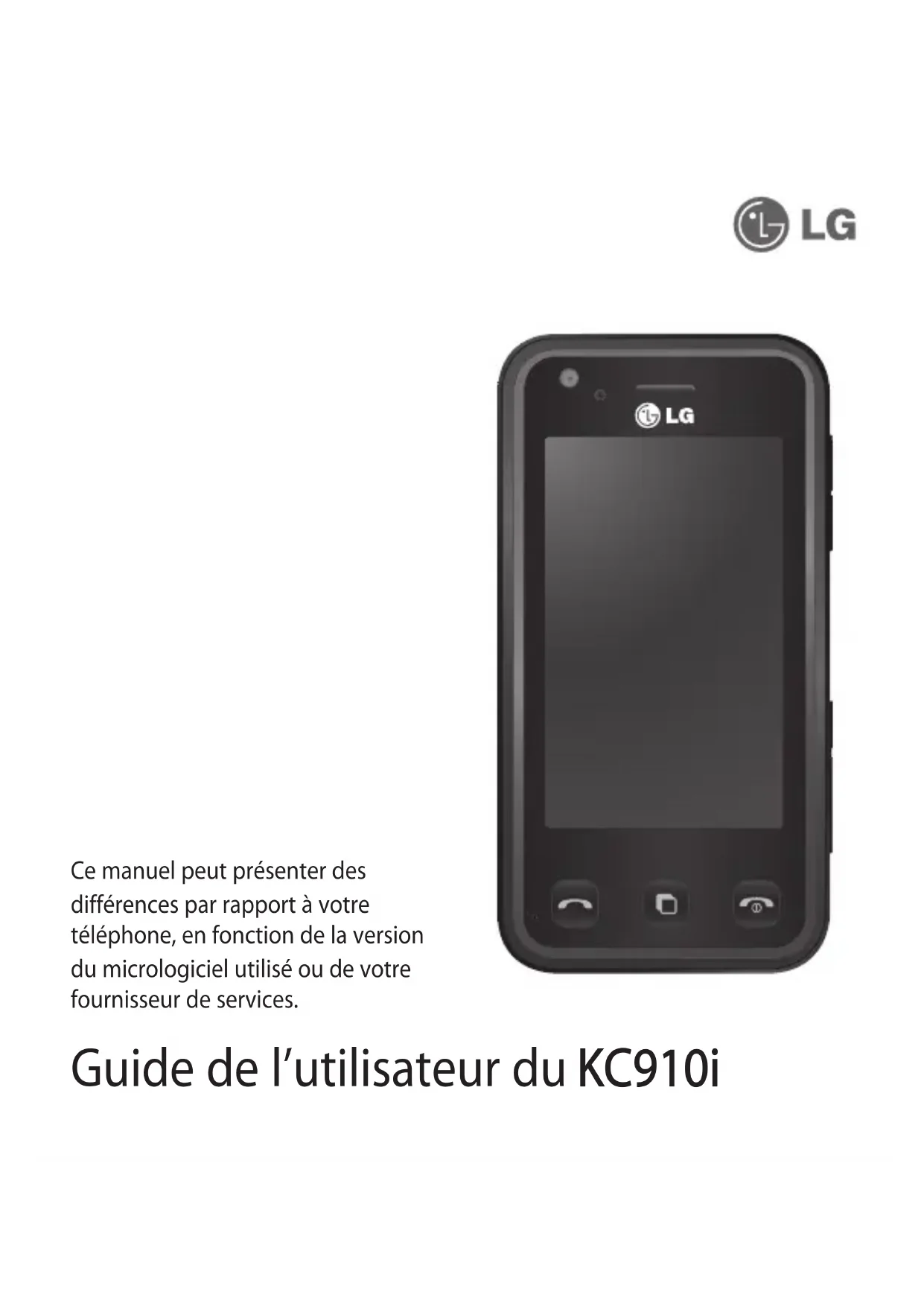 No other express warranty is applicable to this product. THE DURATION OF ANY IMPLIED WARRANTIES, INCLUDING THE IMPLIED WARRANTY OF MARKETABILITY, IS LIMITED TO THE DURATION OF THE EXPRESS WARRANTY HEREIN. LG ELECTRONICS INC. SHALL NOT BE LIABLE FOR THE LOSS OF THE USE OF THE PRODUCT, INCONVENIENCE, LOSS OR ANY OTHER DAMAGES, DIRECT OR CONSEQUENTIAL, ARISING OUT OF THE USE OF, OR INABILITY TO USE, THIS PRODUCT OR FOR ANY BREACH OF ANY EXPRESS OR IMPLIED WARRANTY, INCLUDING THE IMPLIED WARRANTY OF MARKETABILITY APPLICABLE TO THIS PRODUCT. Some do not allow the exclusive of limitation of incidental or consequential damages or limitations on how long an implied warranty lasts; so these limitations or exclusions may not apply to you. This warranty gives you specifi c legal rights and you may also have other rights which vary from country to country.Guide de l’utilisateur du KC910i KC910i Ce manuel peut présenter des différences par rapport à votre téléphone, en fonction de la version du micrologiciel utilisé ou de votre fournisseur de services.Félicitations ! Vous venez de faire l’acquisition du KC910i, un téléphone portable sophistiqué et compact conçu par LG pour tirer parti des toutes dernières technologies de communication mobile numérique. Recyclage de votre ancien téléphone 1 Ce symbole, représentant une poubelle sur roulettes barrée d’une croix, signifie que le produit est couvert par la directive européenne 2002/96/EC. 2 Les éléments électriques et électroniques doivent être jetés séparément, dans les vide-ordures prévus à cet effet par votre municipalité ou être rapportés dans un magasin de téléphonie mobile. 3 Le recyclage de votre téléphone dans une poubelle appropriée ou dans un magasin de téléphonie mobile aidera à réduire les risques pour l’environnement et votre santé. 4 Pour plus d’informations concernant l’élimination de votre ancien appareil, veuillez contacter votre mairie, le service des ordures ménagères ou encore le magasin où vous avez acheté ce produit.Configurer Votre écran d’accueil Fonctions de base Création Organisation Web Paramètres Accessoires