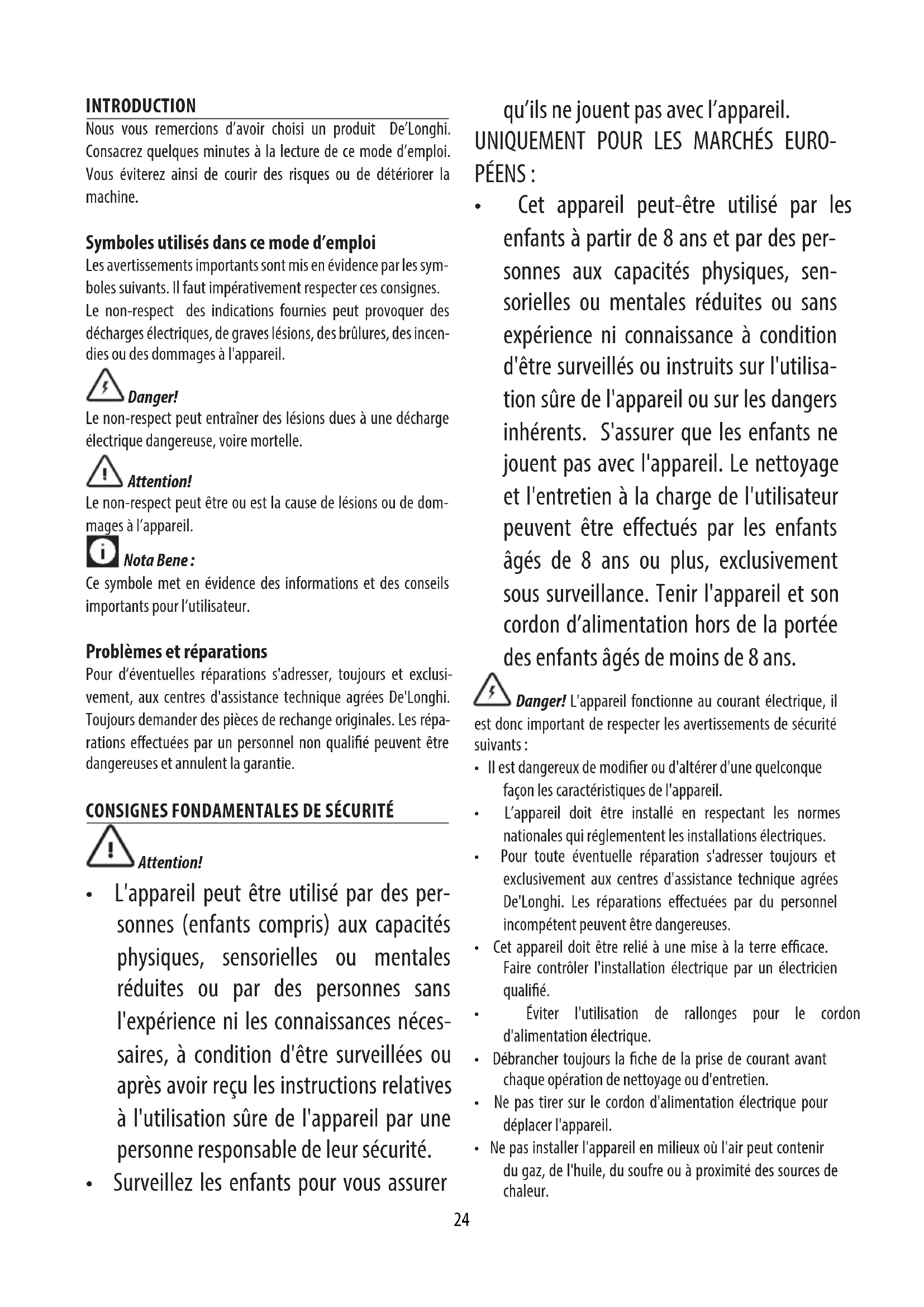 INTRODUCTION Nous vous remercions d’avoir choisi un produit De’Longhi. Consacrez quelques minutes à la lecture de ce mode d’emploi. Vous éviterez ainsi de courir des risques ou de détériorer la machine. Symboles utilisés dans ce mode d’emploi Les avertissements importants sont mis en évidence par les sym- boles suivants. Il faut impérativement respecter ces consignes. Le non-respect des indications fournies peut provoquer des décharges électriques, de graves lésions, des brûlures, des incen- dies ou des dommages à l'appareil. Danger! Le non-respect peut entraîner des lésions dues à une décharge électrique dangereuse, voire mortelle. Attention! Le non-respect peut être ou est la cause de lésions ou de dom- mages à l’appareil. Nota Bene : Ce symbole met en évidence des informations et des conseils importants pour l’utilisateur. Problèmes et réparations Pour d’éventuelles réparations s'adresser, toujours et exclusi- vement, aux centres d'assistance technique agrées De'Longhi. Toujours demander des pièces de rechange originales. Les répa- rations eectuées par un personnel non qualié peuvent être dangereuses et annulent la garantie.