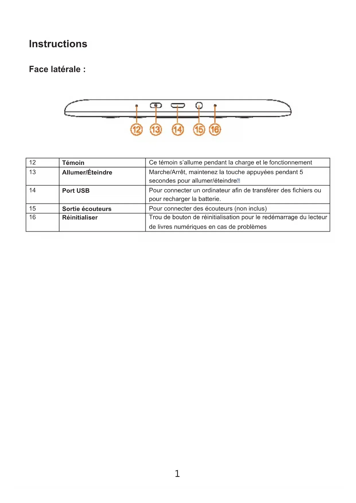 Réinitialiser Trou de bouton de réinitialisation pour le redémarrage du lecteur de livres numériques en cas de problèmes2 Face avant: