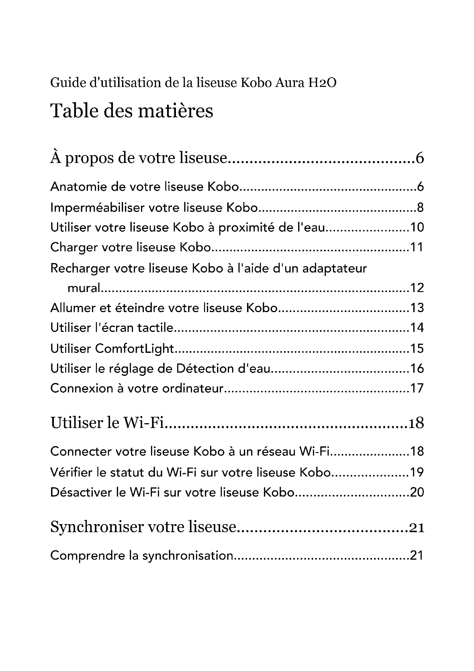 - Guide d’utilisationGuide d'utilisation de la liseuse Kobo Aura H2O Table des matières À propos de votre liseuse p. 6