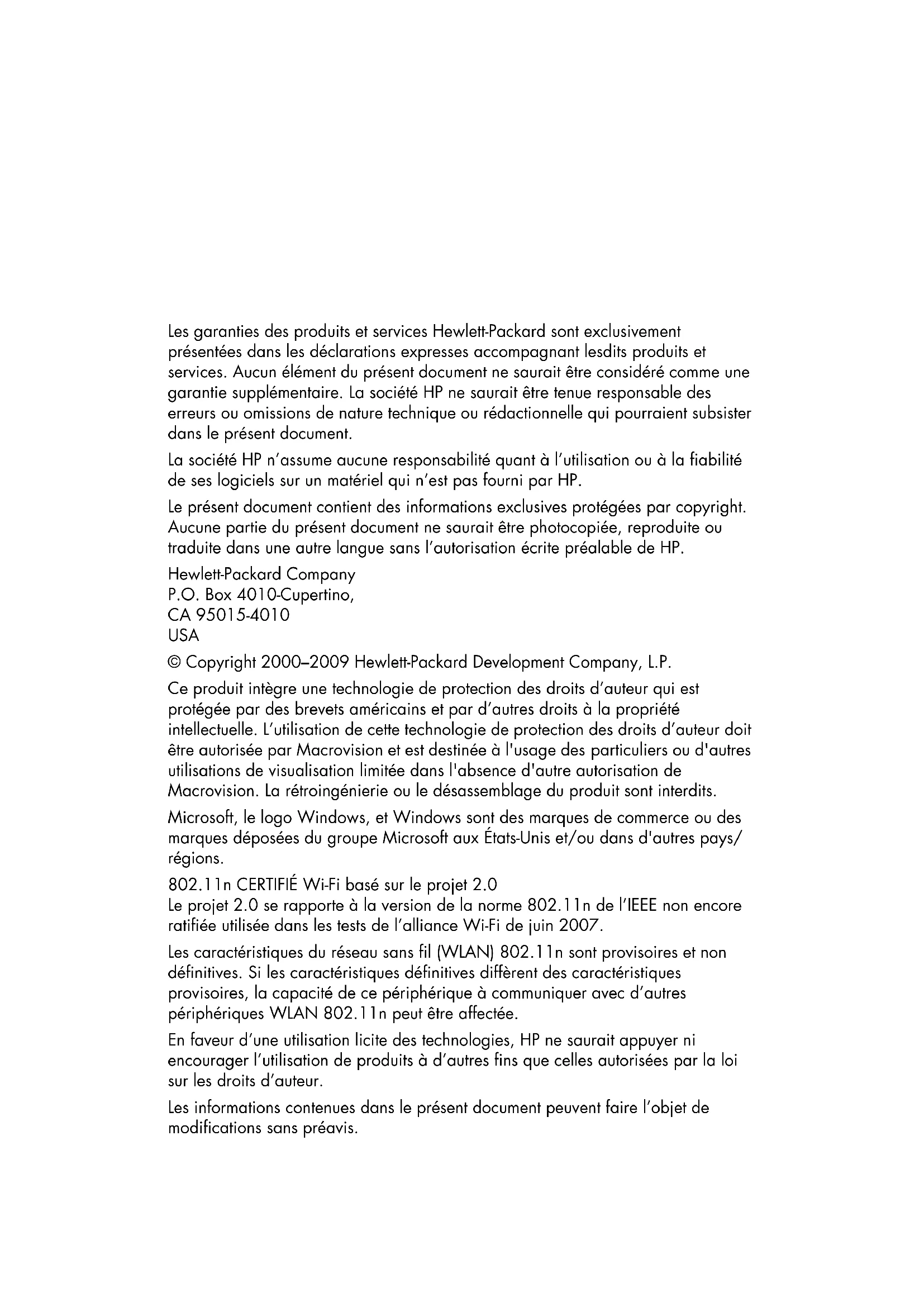 - Windows Update 18 wired network 6 wireless devices troubleshooting 43 wireless LAN checking installation 37 connection 6 network device 37 security 15 working in comfort 27Démarrage rapideLes garanties des produits et services Hewlett-Packard sont exclusivement présentées dans les déclarations expresses accompagnant lesdits produits et services. Aucun élément du présent document ne saurait être considéré comme une garantie supplémentaire. La société HP ne saurait être tenue responsable des erreurs ou omissions de nature technique ou rédactionnelle qui pourraient subsister dans le présent document. La société HP n’assume aucune responsabilité quant à l’utilisation ou à la fiabilité de ses logiciels sur un matériel qui n’est pas fourni par HP. Le présent document contient des informations exclusives protégées par copyright. Aucune partie du présent document ne saurait être photocopiée, reproduite ou traduite dans une autre langue sans l’autorisation écrite préalable de HP. Hewlett-Packard Company P.O. Box 4010-Cupertino, CA 95015-4010 USA © Copyright 2000–2009 Hewlett-Packard Development Company, L.P. Ce produit intègre une technologie de protection des droits d’auteur qui est protégée par des brevets américains et par d’autres droits à la propriété intellectuelle. L’utilisation de cette technologie de protection des droits d’auteur doit être autorisée par Macrovision et est destinée à l'usage des particuliers ou d'autres utilisations de visualisation limitée dans l'absence d'autre autorisation de Macrovision. La rétroingénierie ou le désassemblage du produit sont interdits. Microsoft, le logo Windows, et Windows sont des marques de commerce ou des marques déposées du groupe Microsoft aux États-Unis et/ou dans d'autres pays/ régions. 802.11n CERTIFIÉ Wi-Fi basé sur le projet 2.0 Le projet 2.0 se rapporte à la version de la norme 802.11n de l’IEEE non encore ratifiée utilisée dans les tests de l’alliance Wi-Fi de juin 2007. Les caractéristiques du réseau sans fil (WLAN) 802.11n sont provisoires et non définitives. Si les caractéristiques définitives diffèrent des caractéristiques provisoires, la capacité de ce périphérique à communiquer avec d’autres périphériques WLAN 802.11n peut être affectée. En faveur d’une utilisation licite des technologies, HP ne saurait appuyer ni encourager l’utilisation de produits à d’autres fins que celles autorisées par la loi sur les droits d’auteur. Les informations contenues dans le présent document peuvent faire l’objet de modifications sans préavis.Sommaire iii Sommaire Configuration de votre ordinateur p. 1