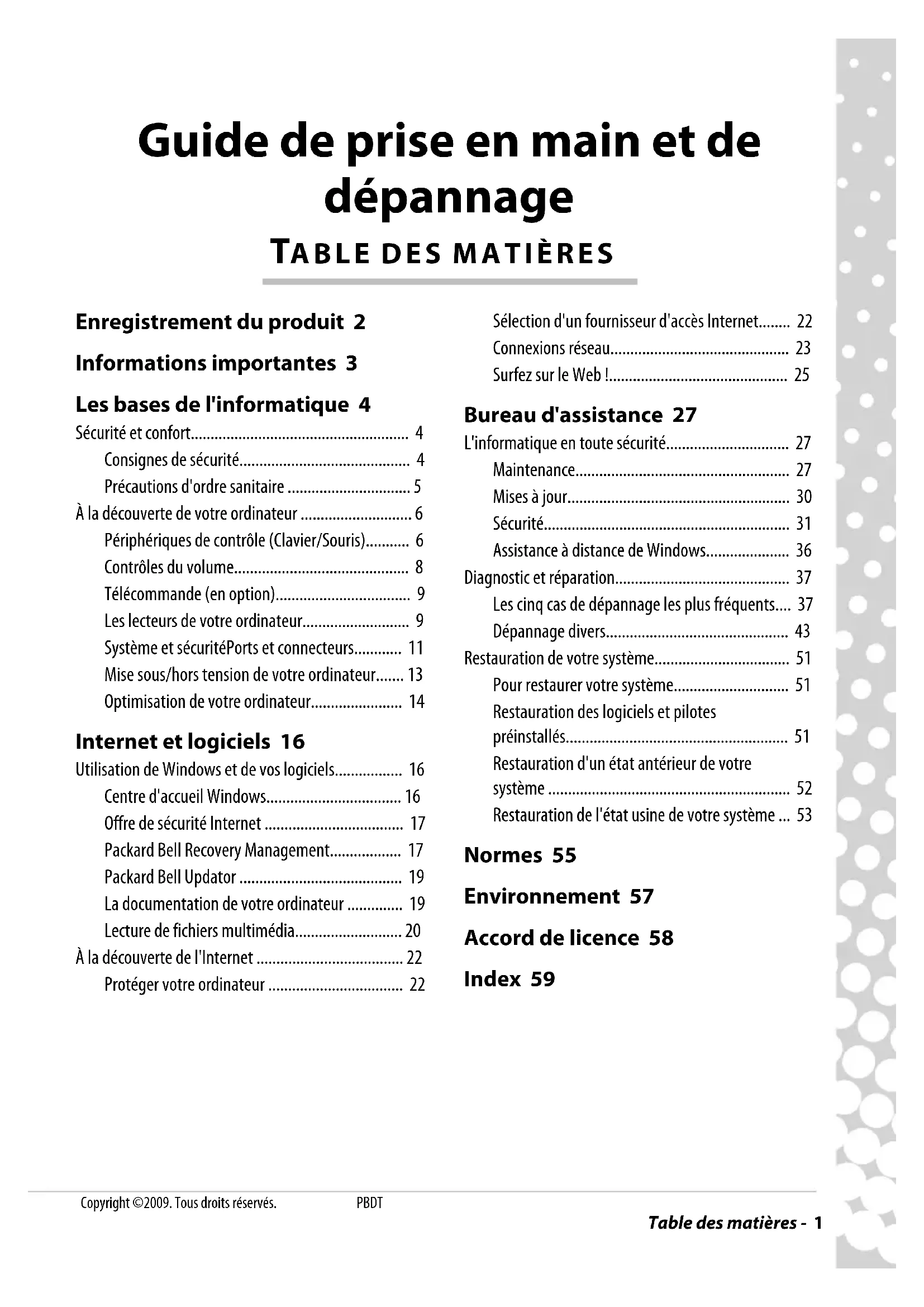 - Restauration de l'état usine de votre système Normes 55 Environnement 57 Accord de licence 58 Index 59 Copyright ©2009. Tous droits réservés. PBDT2 - Guide de prise en main et de dépannage p. 53