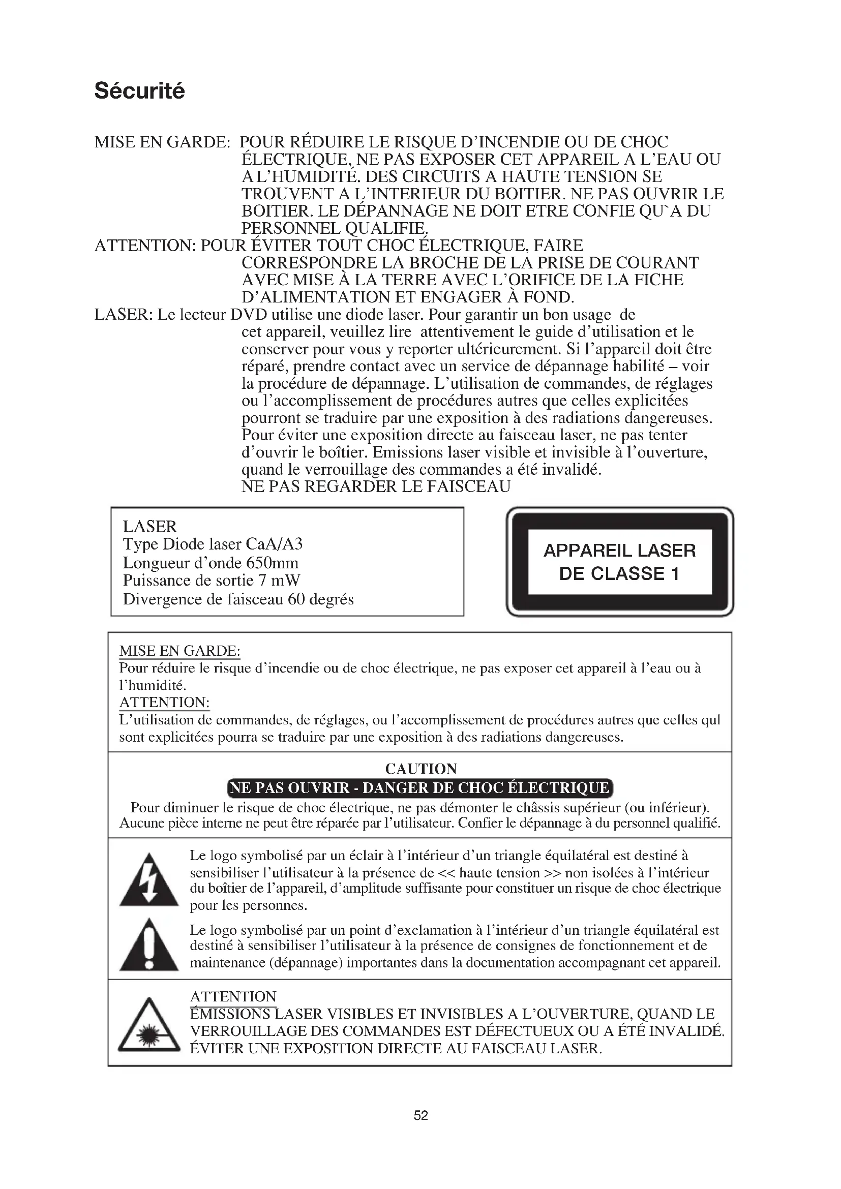 Le logo symbolisé par un éclair à l’intérieur d’un triangle équilatéral est destiné à sensibiliser l’utilisateur à la présence de << haute tension >> non isolées à l’intérieur du boîtier de l’appareil, d’amplitude suffisante pour constituer un risque de choc électrique pour les personnes. Le logo symbolisé par un point d’exclamation à l’intérieur d’un triangle équilatéral est destiné à sensibiliser l’utilisateur à la présence de consignes de fonctionnement et de maintenance (dépannage) importantes dans la documentation accompagnant cet appareil. ATTENTION ÉMISSIONS LASER VISIBLES ET INVISIBLES A L’OUVERTURE, QUAND LE VERROUILLAGE DES COMMANDES EST DÉFECTUEUX OU A ÉTÉ INVALIDÉ. ÉVITER UNE EXPOSITION DIRECTE AU FAISCEAU LASER. MISE EN GARDE: Pour réduire le risque d’incendie ou de choc électrique, ne pas exposer cet appareil à l’eau ou à l’humidité. ATTENTION: L’utilisation de commandes, de réglages, ou l’accomplissement de procédures autres que celles qul sont explicitées pourra se traduire par une exposition à des radiations dangereuses. CAUTION NE PAS OUVRIR - DANGER DE CHOC ÉLECTRIQUE Pour diminuer le risque de choc électrique, ne pas démonter le châssis supérieur (ou inférieur). Aucune pièce interne ne peut être réparée par l’utilisateur. Confier le dépannage à du personnel qualifié. LASER Type Diode laser CaA/A3 Longueur d’onde 650mm Puissance de sortie 7 mW Divergence de faisceau 60 degrés APPAREIL LASER DE CLASSE 1 52Consignes de Sécurité Importantes