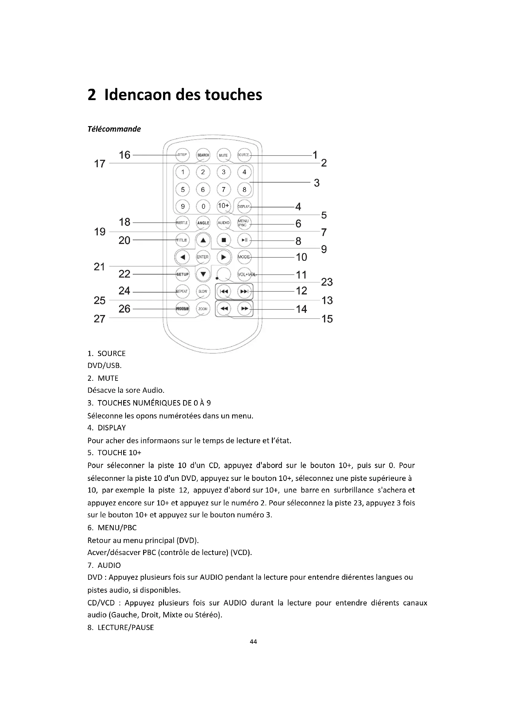 Pour sélectionner la piste 10 d'un CD, appuyez d'abord sur le bouton 10+, puis sur 0. Pour sélectionner la piste 10 d'un DVD, appuyez sur le bouton 10+, sélectionnez une piste supérieure à 10, par exemple la piste 12, appuyez d'abord sur 10+, une barre en surbrillance s'affichera et appuyez encore sur 10+ et appuyez sur le numéro 2. Pour sélectionnez la piste 23, appuyez 3 fois sur le bouton 10+ et appuyez sur le bouton numéro 3.