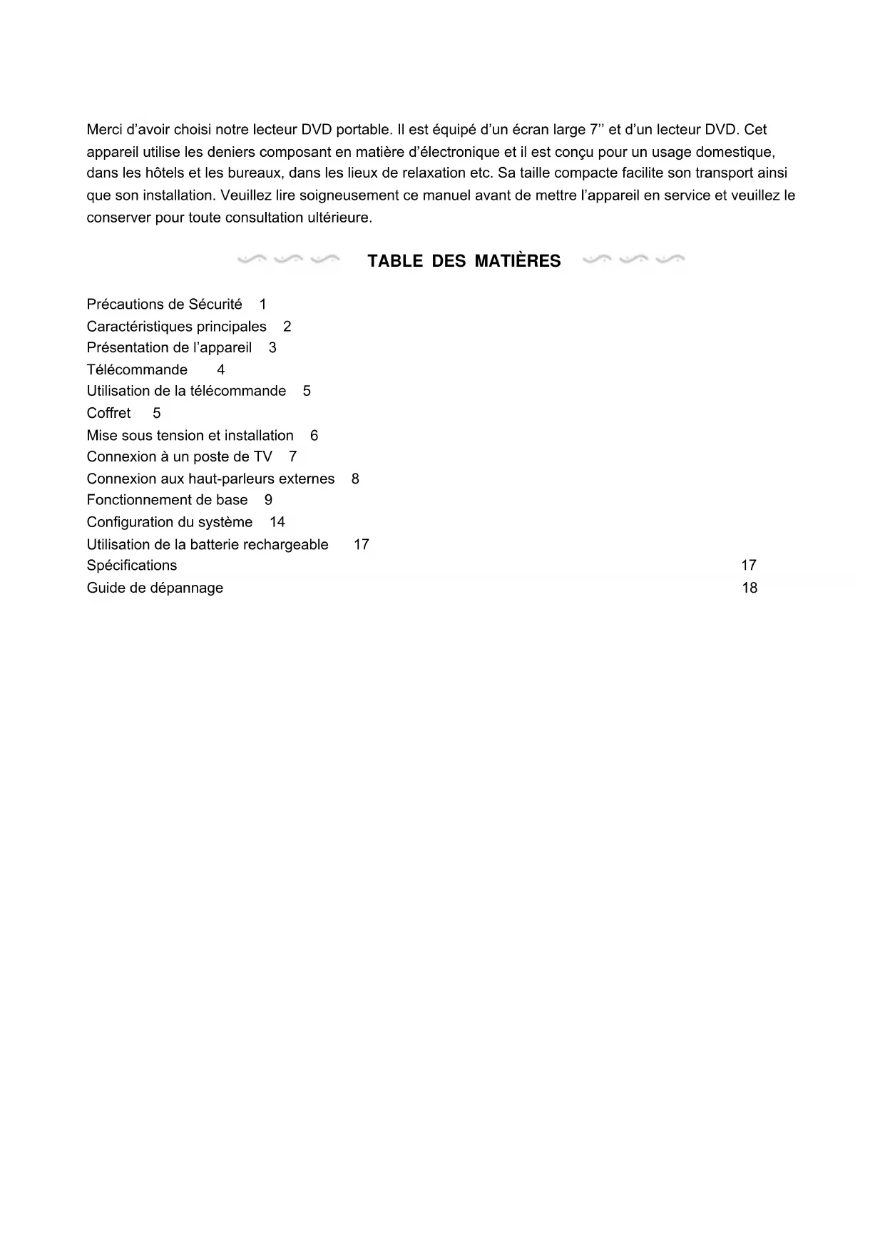 Précautions de Sécurité 1 Caractéristiques principales 2 Présentation de l’appareil 3 Télécommande 4 Utilisation de la télécommande 5 Coffret 5 Mise sous tension et installation 6 Connexion à un poste de TV 7 Connexion aux haut-parleurs externes 8 Fonctionnement de base 9 Configuration du système 14 Utilisation de la batterie rechargeable 17 Spécifications 17 Guide de dépannage 18Précautions de sécurité