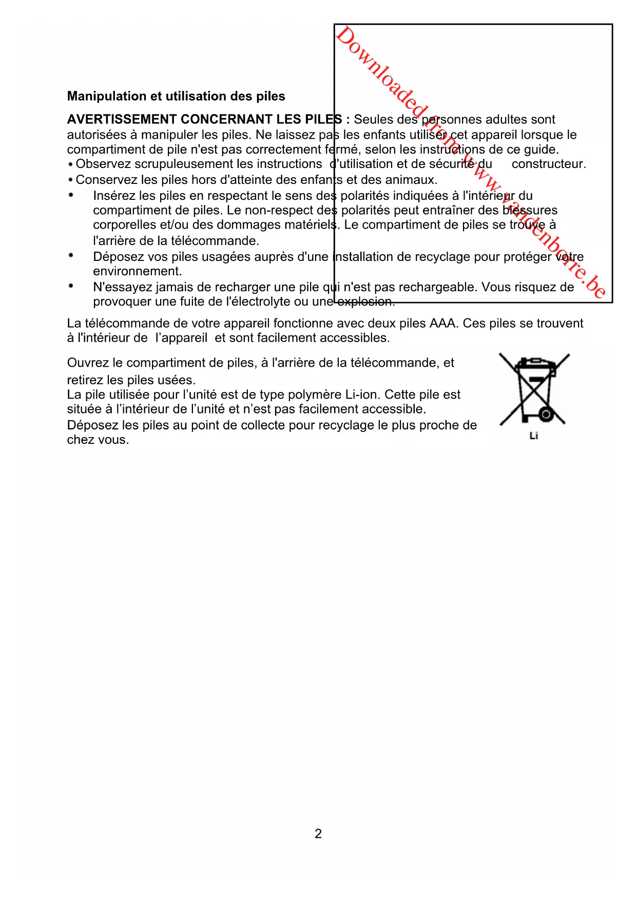 - Ne jetez pas les piles dans un feu car cela constitue un danger d'explosion.Downloaded from www.vandenborre.be