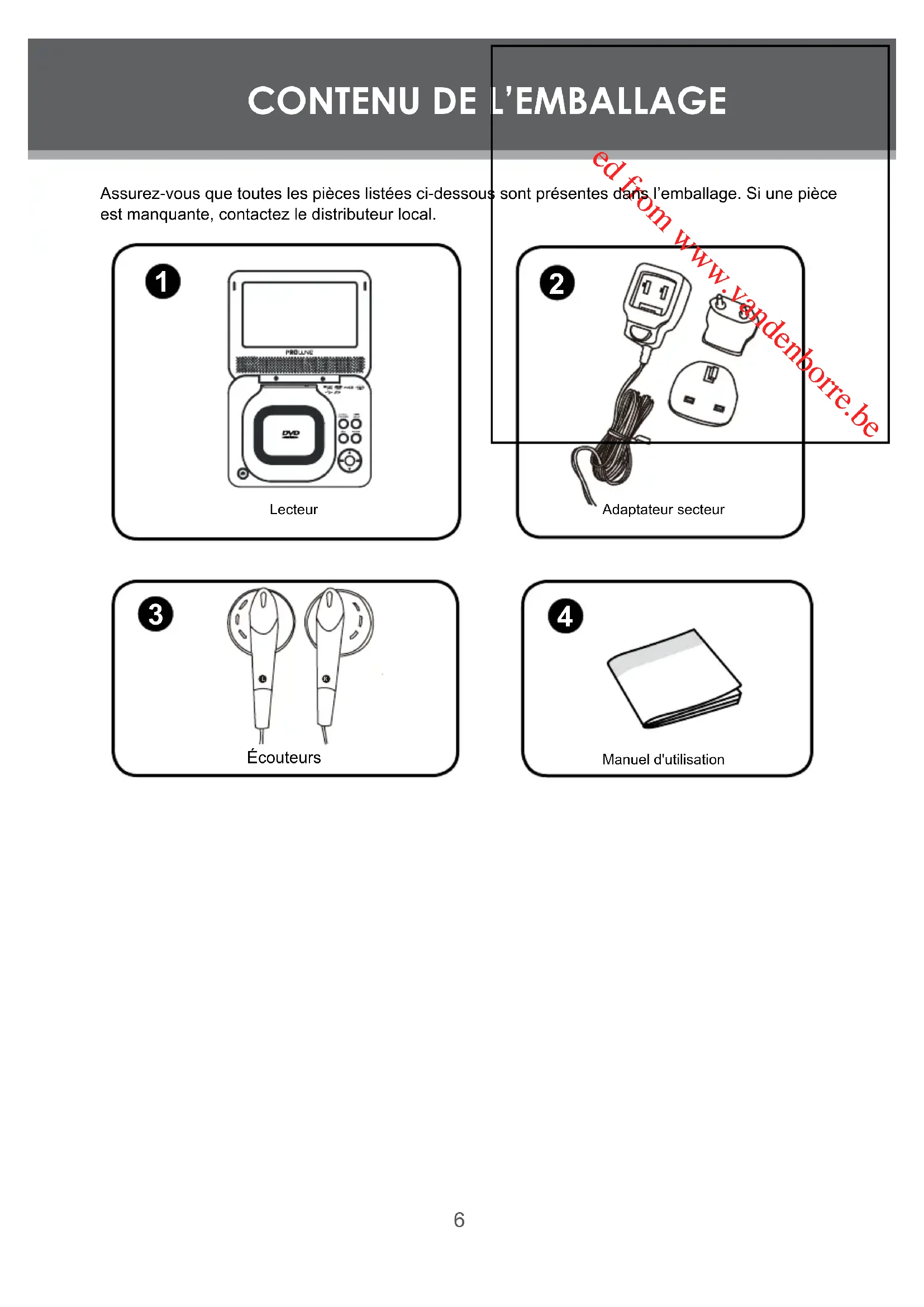 - MAUVAIS DISQUE. Le lecteur intègre un logiciel de détection automatique de la qualité des disques. S’il détecte qu’un disque est endommagé ou que son format est incorrect, il peut lire le disque avec une qualité dégradée ou ne pas le lire en entier, en fonction de l’état de détérioration du disque. Remarque : La qualité de production des DVD peut varier. Certains disques peuvent ne pas être conformes aux standards industriels. Certains disques incorrectement formatés peuvent tout de même être lus, mais la qualité de lecture est alors inférieure à ce qu’elle devrait être. Gestion de l’alimentation Positionnez l'interrupteur sur OFF (hors tension) et débranchez le lecteur de l’alimentation électrique avant toute période d’inutilisation prolongée. Écran de veille Si vous arrêtez d’utiliser le lecteur pendant 5 minutes, son écran de veille s’affiche automatiquement. Appuyez sur n’importe quelle touche pour réactiver le lecteur. Si vous n’appuyez sur aucune touche pendant 6 minutes, le lecteur se met en veille, vous devez alors appuyer sur la touche Entrer pour le rallumer.Downloaded from www.vandenborre.beDownloaded from www.vandenborre.be