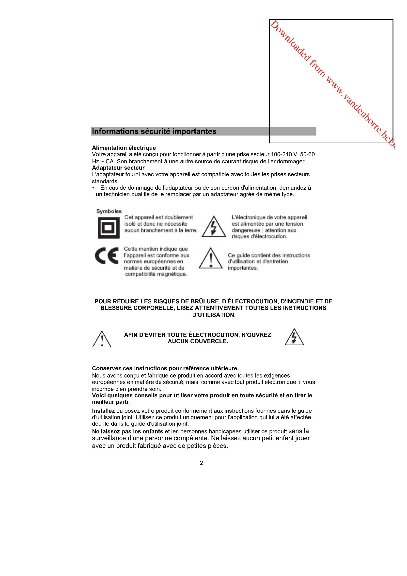 AUCUN COUVERCLE. Conservez ces instructions pour référence ultérieure. Nous avons conçu et fabriqué ce produit en accord avec toutes les exigences européennes en matière de sécurité, mais, comme avec tout produit électronique, il vous incombe d'en prendre soin. Voici quelques conseils pour utiliser votre produit en toute sécurité et en tirer le meilleur parti. Installez ou posez votre produit conformément aux instructions fournies dans le guide d'utilisation joint. Utilisez ce produit uniquement pour l'application qui lui a été affectée, décrite dans le guide d'utilisation joint. Ne laissez pas les enfants et les personnes handicapées utiliser ce produit sans la surveillance d'une personne compétente. Ne laissez aucun petit enfant jouer avec un produit fabriqué avec de petites pièces.Downloaded from www.vandenborre.beDownloaded from www.vandenborre.be