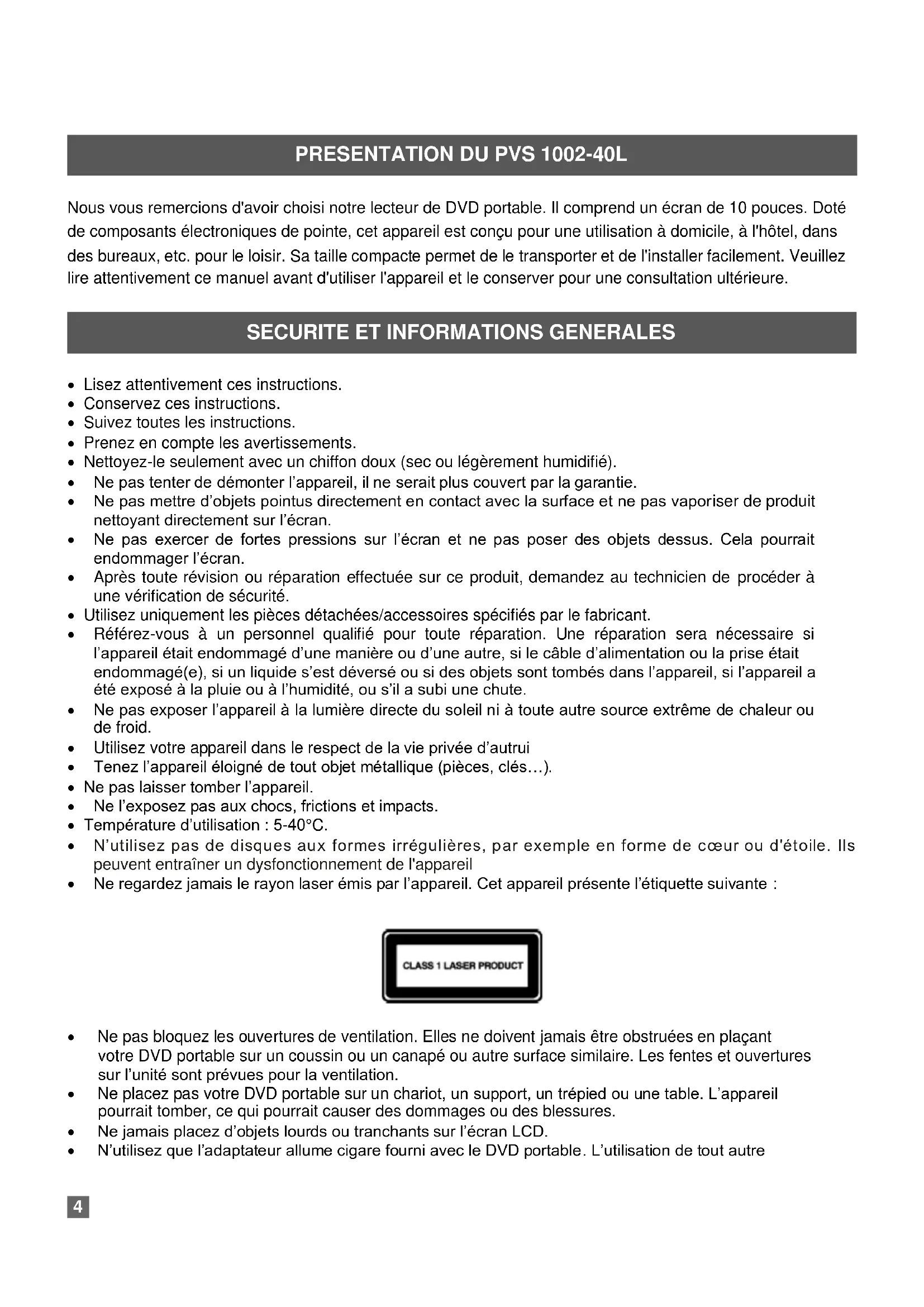 Nos you remercions d'avoir choisi notre lecteur de DVD portable. Il comprend un ecran de 10 pouces. Doté de composants électroniques de pointe, cet apparéil est concu pour une utilisation à domicile, à l'hôtel, dans des bureaux, etc. pour le loisir. Sa taille compacte permet de le transporter et de l'installer facilement. Veuillez dire attentivement ce manuel avant d'utiliser l' apparéil et le conserver pour une consultation ultérieure.