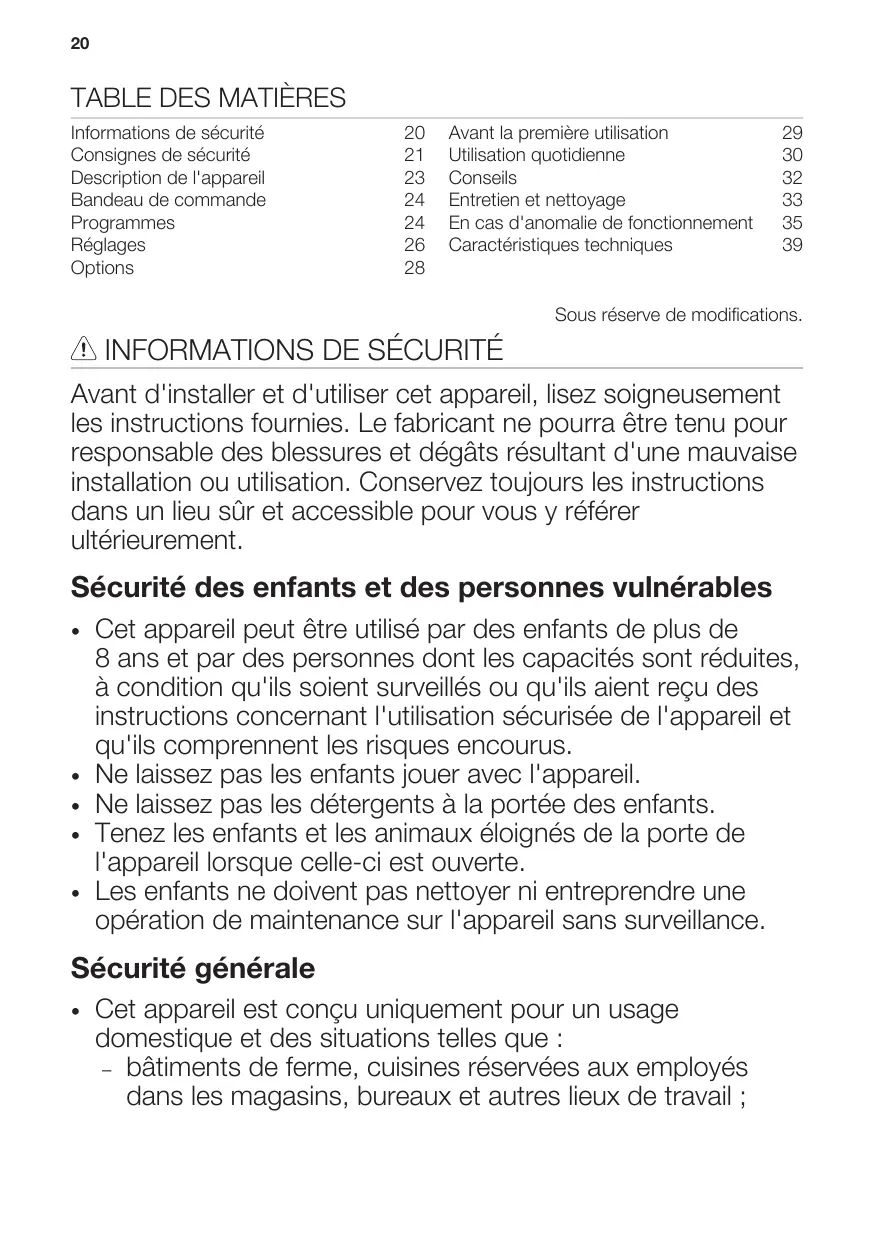 Informations de sécurité Consignes de sécurité Description de l'appareil Bandeau de commande Programmes Réglages Options