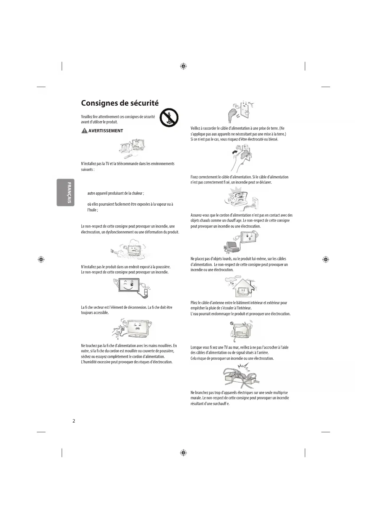 - -FU¨M¨WJTFVS-&%EF-(DPNCJOFVO¨DSBO-$%FUVOS¨USP¨DMBJSBHF-&%2 Consignes de sécurité Veuillez lire attentivement ces consignes de sécurité avant d’utiliser le produit. AVERTISSEMENT N’installez pas la TV et la télécommande dans les environnements suivants: tUn emplacement exposé à la lumière directe du soleil; tUne zone fortement humide comme une salle de bain; tÀ proximité d’une source de chaleur comme une cuisinière et tout autre appareil produisant de la chaleur; tÀ proximité d’un plan de travail de cuisine ou d’un humidi cateur où elles pourraient facilement être exposées à la vapeur ou à l’huile; tUne zone exposée à la pluie et au vent; tÀ proximité de conteneurs d’eau comme des vases. Le non-respect de cette consigne peut provoquer un incendie, une électrocution, un dysfonctionnement ou une déformation du produit. N’installez pas le produit dans un endroit exposé à la poussière. Le non-respect de cette consigne peut provoquer un incendie. La che secteur est l’élément de déconnexion. La che doit être toujours accessible. Ne touchez pas la che d’alimentation avec les mains mouillées. En outre, si la che du cordon est mouillée ou couverte de poussière, séchez ou essuyez complètement le cordon d’alimentation. L’humidité excessive peut provoquer des risques d’électrocution. Veillez à raccorder le câble d’alimentation à une prise de terre. (Ne s’applique pas aux appareils ne nécessitant pas une mise à la terre.) Si ce n’est pas le cas, vous risquez d’être électrocuté ou blessé. Fixez correctement le câble d’alimentation. Si le câble d’alimentation n’est pas correctement xé, un incendie peut se déclarer. Assurez-vous que le cordon d’alimentation n’est pas en contact avec des objets chauds comme un chau age. Le non-respect de cette consigne peut provoquer un incendie ou une électrocution. Ne placez pas d’objets lourds, ou le produit lui-même, sur les câbles d’alimentation. Le non-respect de cette consigne peut provoquer un incendie ou une électrocution. Pliez le câble d’antenne entre le bâtiment intérieur et extérieur pour empêcher la pluie de s’écouler à l’intérieur. L’eau pourrait endommager le produit et provoquer une électrocution. Lorsque vous xez une TV au mur, veillez à ne pas l’accrocher à l’aide des câbles d’alimentation ou de signal situés à l’arrière. Cela risque de provoquer un incendie ou une électrocution. Ne branchez pas trop d’appareils électriques sur une seule multiprise murale. Le non-respect de cette consigne peut provoquer un incendie résultant d’une surchau e. FRANÇAIS3 Ne faites pas tomber le produit ou ne le laissez pas tomber lors du branchement de périphériques externes. Le non-respect de cette consigne peut entraîner des blessures ou endommager le produit. Desiccant Conservez le matériau d’emballage anti-moisissure ou l’emballage en vinyle hors de portée des enfants. Le matériau anti-moisissure est dangereux en cas d’ingestion. En cas d’ingestion par mégarde, faites vomir la personne et rendez-vous à l’hôpital le plus proche. En outre, l’emballage en vinyle peut entraîner une asphyxie. Conservez-le hors de portée des enfants. Ne laissez pas les enfants grimper sur la TV ou s’agripper dessus. Dans le cas contraire, la TV risque de tomber, ce qui peut entraîner des blessures graves. Respectez les règles de sécurité lors de la mise au rebut des batteries pour éviter qu’un enfant ne les avale. En cas d’ingestion, consultez immédiatement un médecin. N’insérez pas de conducteur (comme une baguette métallique) dans l’une des extrémités du câble d’alimentation si l’autre extrémité est reliée au terminal d’entrée mural. En outre, ne touchez pas le câble d’alimentation juste après le raccordement au terminal d’entrée mural. Vous pourriez vous électrocuter.(selon le modèle) Veillez à ne pas placer ou conserver des substances inammables à proximité du produit. Une manipulation imprudente des substances inammables présente un risque d’explosion ou d’incendie. Ne laissez pas tomber d’objets métalliques (pièces de monnaie, épingles à cheveux, baguettes métalliques ou ls) ou d’objets inammables (papier et allumettes) dans le produit. Surveillez particulièrement les enfants. Cela pourrait provoquer une électrocution, un incendie ou des blessures. Si un corps étranger tombe dans le produit, débranchez le câble d’alimentation et contactez le centre de services. Ne vaporisez pas d’eau sur le produit ou ne le frottez pas avec une substance inammable (diluant ou benzène). Vous risqueriez de provoquer une électrocution ou un incendie. Évitez tout impact d’objets avec l’appareil ou toute chute d’objets sur l’appareil, et ne laissez rien tomber sur l’écran. Vous risqueriez de vous blesser ou d’endommager le produit. Ne touchez jamais ce produit ou l’antenne en cas de tonnerre ou d’orage. Vous pourriez vous électrocuter. Ne touchez jamais la prise murale lors d’une fuite de gaz; ouvrez les fenêtres et aérez la pièce. Le non-respect de cette consigne peut provoquer un incendie ou des brûlures dues aux étincelles. Ne démontez pas le produit, ne le réparez pas et n’y apportez aucune modication. Vous risqueriez de provoquer une électrocution ou un incendie. Contactez le centre de services pour les vérications, les calibrages et les réparations. FRANÇAIS4 Si vous êtes confronté à l’une des situations suivantes, débranchez immédiatement le produit et contactez votre centre de services local. tLe produit a reçu un choc tLe produit a été endommagé tDes corps étrangers sont entrés dans le produit tLe produit dégage de la fumée ou une odeur étrange Le non-respect de cette consigne peut provoquer un incendie ou une électrocution. Si vous n’utilisez pas le produit pendant une période prolongée, débranchez le câ