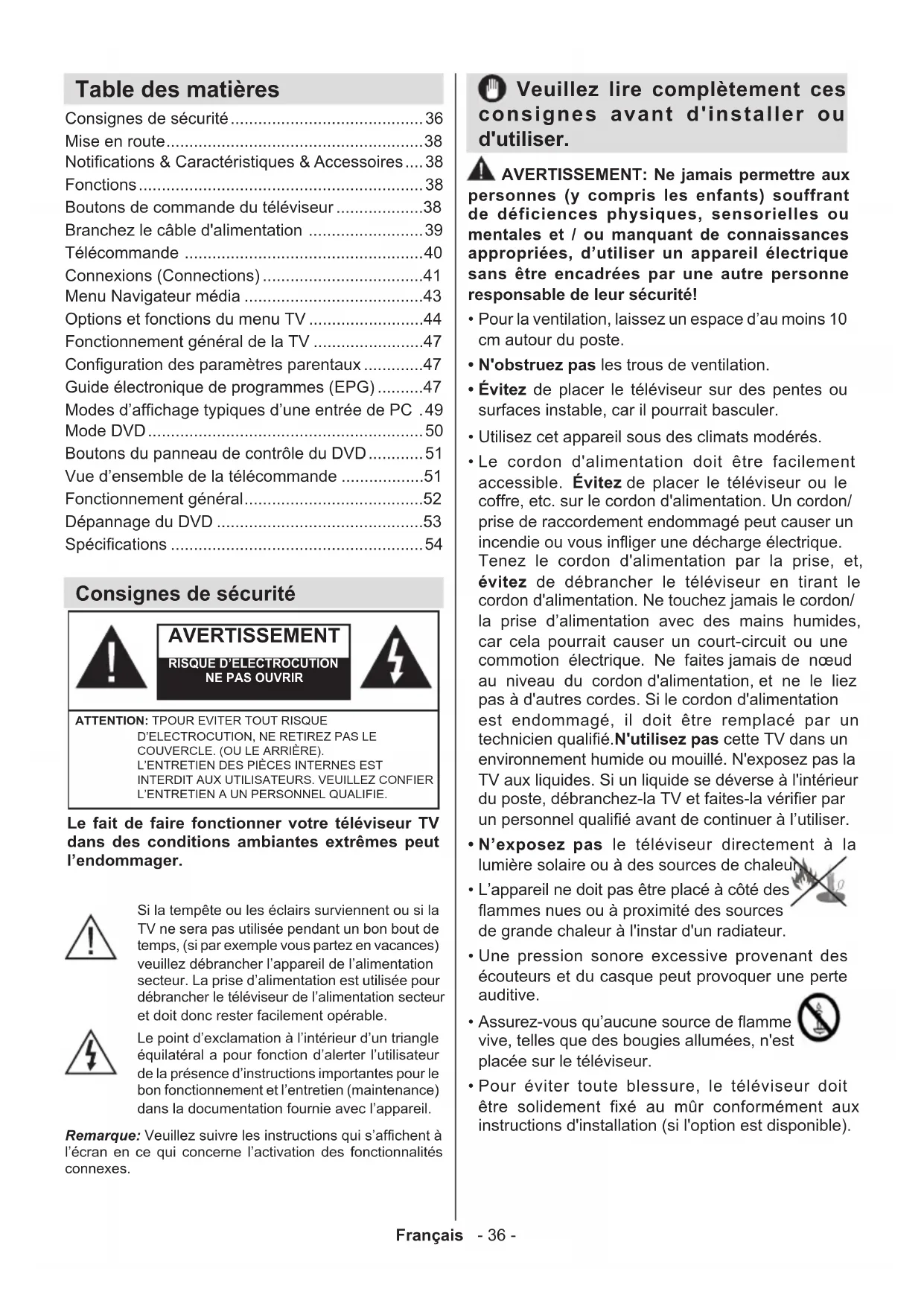 - Français - 36 - Consignes de sécurité Le fait de faire fonctionner votre téléviseur TV dans des conditions ambiantes extrêmes peut l’endommager. AVERTISSEMENT RISQUE D’ELECTROCUTIONNE PAS OUVRIRATTENTION: TPOUR EVITER TOUT RISQUE D’ELECTROCUTION, NE RETIREZ PAS LE COUVERCLE. (OU LE ARRIÈRE). L’ENTRETIEN DES PIÈCES INTERNES EST INTERDIT AUX UTILISATEURS. VEUILLEZ CONFIER L’ENTRETIEN A UN PERSONNEL QUALIFIE.Remarque: Veuillez suivre les instructions qui s’afchent à l’écran en ce qui concerne l’activation des fonctionnalités connexes.Si la tempête ou les éclairs surviennent ou si la TV ne sera pas utilisée pendant un bon bout de temps, (si par exemple vous partez en vacances) veuillez débrancher l’appareil de l’alimentation secteur. La prise d’alimentation est utilisée pour débrancher le téléviseur de l’alimentation secteur et doit donc rester facilement opérable.Le point d’exclamation à l’intérieur d’un triangle équilatéral a pour fonction d’alerter l’utilisateur de la présence d’instructions importantes pour le bon fonctionnement et l’entretien (maintenance) dans la documentation fournie avec l’appareil. Table des matières Consignes de sécurité p. 36