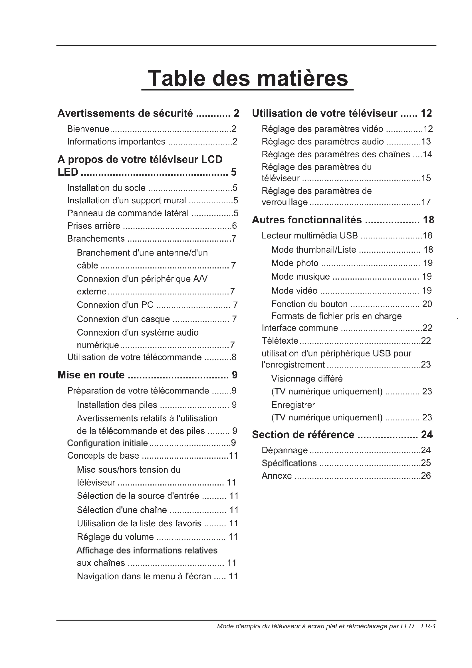 Annexe ...................................................26Avertissements de sécurité FR-2 Mode d'emploi du téléviseur à écran plat et rétroéclairage par LED Bienvenue Merci d'avoir acheté ce téléviseur à écran plat et rétroéclairage par LED 32 pouces. Le présent mode d'emploi