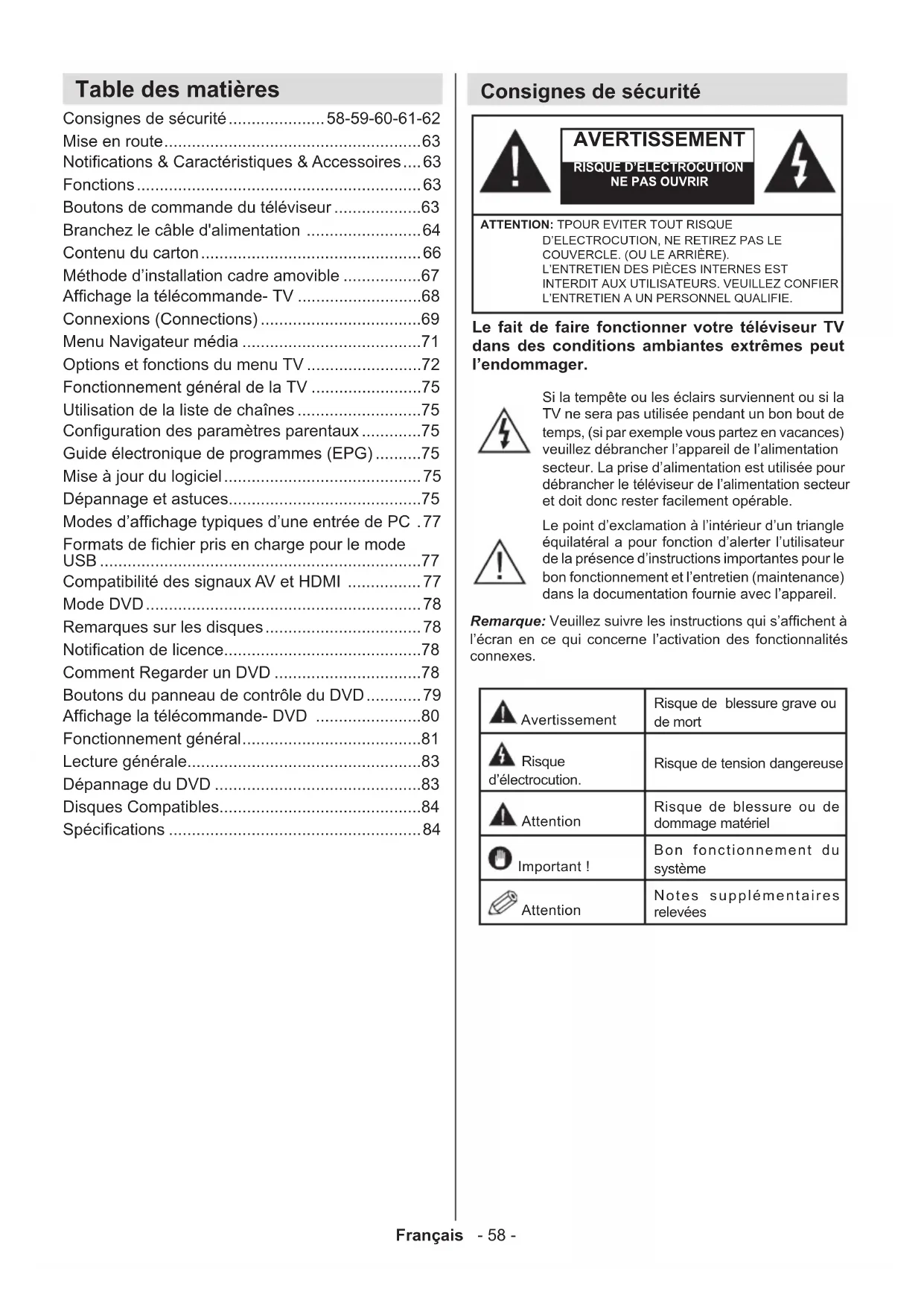 - P12176 (MD 30724) MSN 30016813Français - 58 - Consignes de sécurité Le fait de faire fonctionner votre téléviseur TV dans des conditions ambiantes extrêmes peut l’endommager. AVERTISSEMENT RISQUE D’ELECTROCUTIONNE PAS OUVRIRATTENTION: TPOUR EVITER TOUT RISQUE D’ELECTROCUTION, NE RETIREZ PAS LE COUVERCLE. (OU LE ARRIÈRE). L’ENTRETIEN DES PIÈCES INTERNES EST INTERDIT AUX UTILISATEURS. VEUILLEZ CONFIER L’ENTRETIEN A UN PERSONNEL QUALIFIE.Remarque: Veuillez suivre les instructions qui s’afchent à l’écran en ce qui concerne l’activation des fonctionnalités connexes.Si la tempête ou les éclairs surviennent ou si la TV ne sera pas utilisée pendant un bon bout de temps, (si par exemple vous partez en vacances) veuillez débrancher l’appareil de l’alimentation secteur. La prise d’alimentation est utilisée pour débrancher le téléviseur de l’alimentation secteur et doit donc rester facilement opérable.Le point d’exclamation à l’intérieur d’un triangle équilatéral a pour fonction d’alerter l’utilisateur de la présence d’instructions importantes pour le bon fonctionnement et l’entretien (maintenance) dans la documentation fournie avec l’appareil. Table des matières Consignes de sécurité p. 58