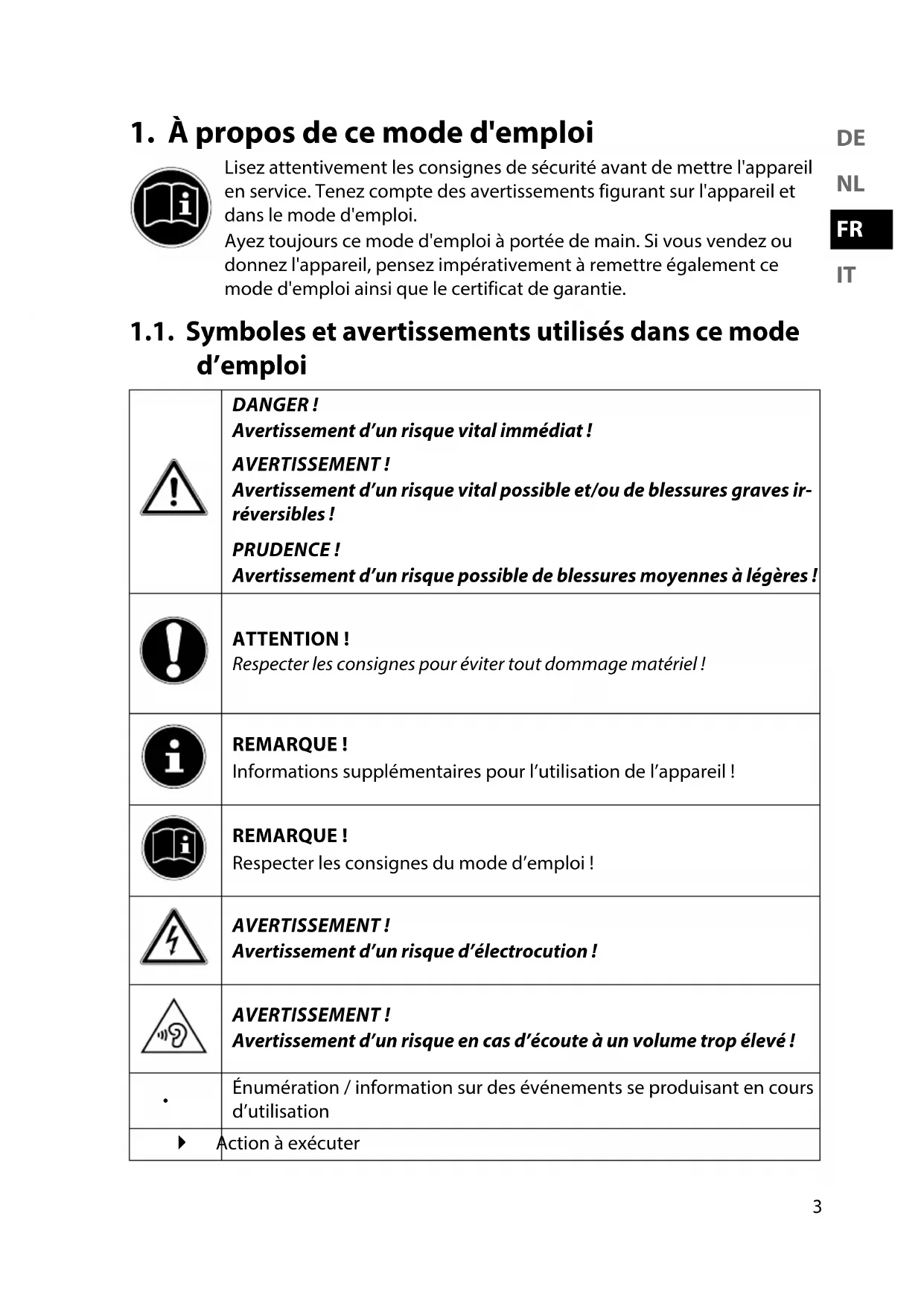 Lisez attentivement les consignes de sécurité avant de mettre l'appareil en service. Tenez compte des avertissements figurant sur l'appareil et dans le mode d'emploi. Ayez toujours ce mode d'emploi à portée de main. Si vous vendez ou donnez l'appareil, pensez impérativement à remettre également ce mode d'emploi ainsi que le certificat de garantie. 1.1. Symboles et avertissements utilisés dans ce mode d’emploi DANGER ! Avertissement d’un risque vital immédiat ! AVERTISSEMENT ! Avertissement d’un risque vital possible et/ou de blessures graves ir- réversibles! PRUDENCE! Avertissement d’un risque possible de blessures moyennes à légères ! ATTENTION! Respecter les consignes pour éviter tout dommage matériel ! REMARQUE! Informations supplémentaires pour l’utilisation de l’appareil ! REMARQUE! Respecter les consignes du mode d’emploi ! AVERTISSEMENT ! Avertissement d’un risque d’électrocution ! AVERTISSEMENT! Avertissement d’un risque en cas d’écoute à un volume trop élevé !