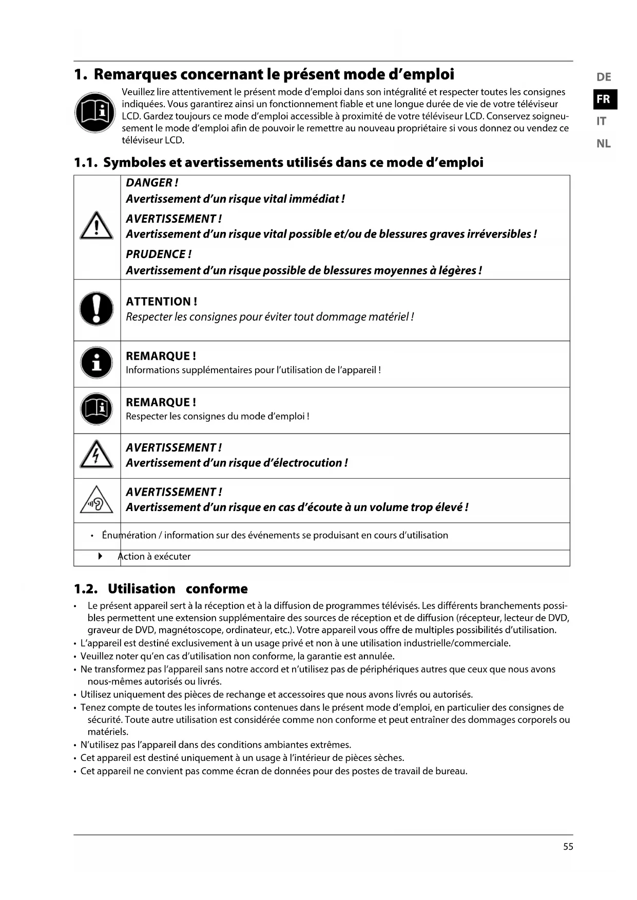 Veuillez lire attentivement le présent mode d’emploi dans son intégralité et respecter toutes les consignes indiquées. Vous garantirez ainsi un fonctionnement fiable et une longue durée de vie de votre téléviseur LCD. Gardez toujours ce mode d’emploi accessible à proximité de votre téléviseur LCD. Conservez soigneu- sement le mode d’emploi afin de pouvoir le remettre au nouveau propriétaire si vous donnez ou vendez ce téléviseur LCD. 1.1. Symboles et avertissements utilisés dans ce mode d’emploi DANGER ! Avertissement d’un risque vital immédiat ! AVERTISSEMENT ! Avertissement d’un risque vital possible et/ou de blessures graves irréversibles! PRUDENCE! Avertissement d’un risque possible de blessures moyennes à légères ! ATTENTION! Respecter les consignes pour éviter tout dommage matériel ! REMARQUE! Informations supplémentaires pour l’utilisation de l’appareil ! REMARQUE! Respecter les consignes du mode d’emploi ! AVERTISSEMENT ! Avertissement d’un risque d’électrocution ! AVERTISSEMENT! Avertissement d’un risque en cas d’écoute à un volume trop élevé !