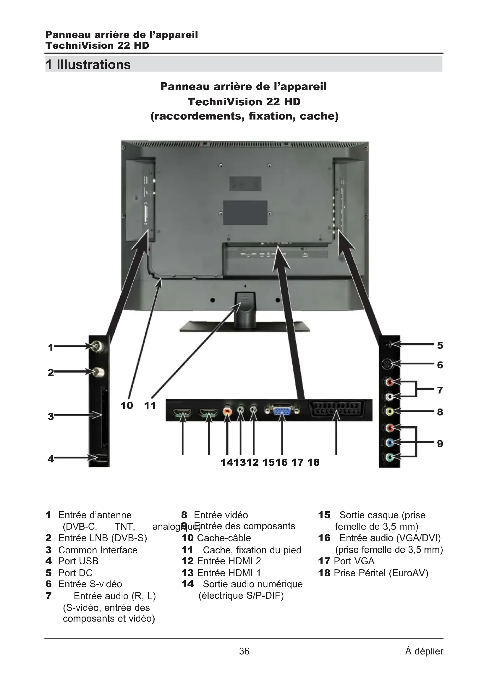 Panneau arrière de l’appareil TechniVision 26 / 32 HD (raccordements, cache) Panneau arrière de l’appareil TechniVision 26 / 32 HD 1 Port USB 2 Common Interface 3 Entrée LNB (DVB-S) 4 Entrée d’antenne (DVB-C, TNT, analogique) 5 Entrée S-vidéo 6 Entrée audio (R, L) (S-vidéo, entrée des composants et vidéo) 7 Entrée vidéo 8 Entrée des composants 9 Interrupteur d’alimentation 10 Prise d’alimentation 11 Cache, fixation du pied 12 Entrée HDMI 2 13 Entrée HDMI 1 14 Sortie audio numérique (électrique S/P-DIF) 15 Sortie casque (prise femelle de 3,5 mm) 16 Entrée audio (VGA/DVI) (prise femelle de 3,5 mm) 17 Port VGA 18 Prise Péritel (EuroAV)