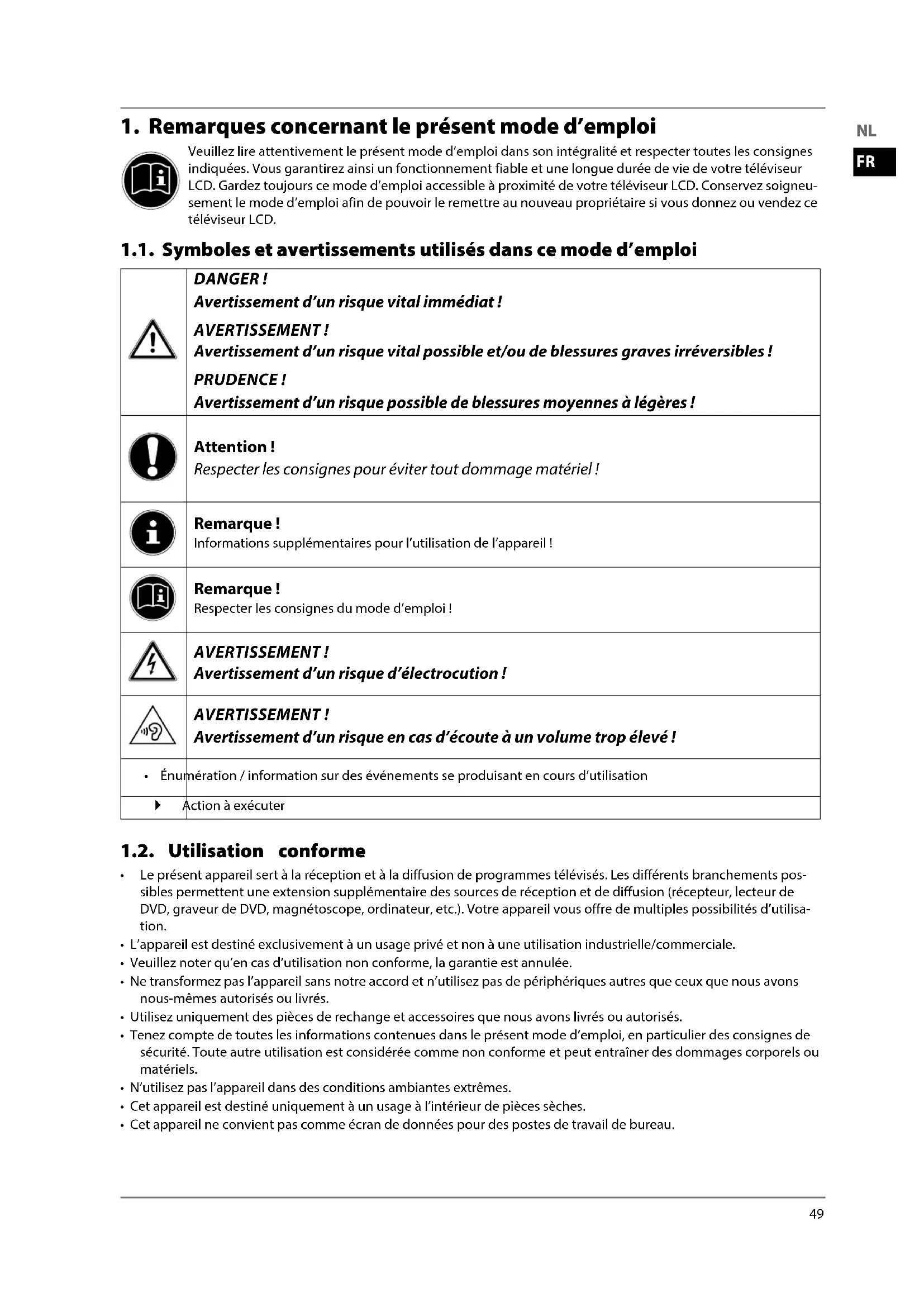 Veuillez lire attentivement le présent mode d’emploi dans son intégralité et respecter toutes les consignes indiquées. Vous garantirez ainsi un fonctionnement fiable et une longue durée de vie de votre téléviseur LCD. Gardez toujours ce mode d’emploi accessible à proximité de votre téléviseur LCD. Conservez soigneu- sement le mode d’emploi afin de pouvoir le remettre au nouveau propriétaire si vous donnez ou vendez ce téléviseur LCD. 1.1. Symboles et avertissements utilisés dans ce mode d’emploi DANGER ! Avertissement d’un risque vital immédiat ! AVERTISSEMENT ! Avertissement d’un risque vital possible et/ou de blessures graves irréversibles! PRUDENCE! Avertissement d’un risque possible de blessures moyennes à légères ! Attention! Respecter les consignes pour éviter tout dommage matériel ! Remarque! Informations supplémentaires pour l’utilisation de l’appareil ! Remarque! Respecter les consignes du mode d’emploi ! AVERTISSEMENT ! Avertissement d’un risque d’électrocution ! AVERTISSEMENT! Avertissement d’un risque en cas d’écoute à un volume trop élevé !