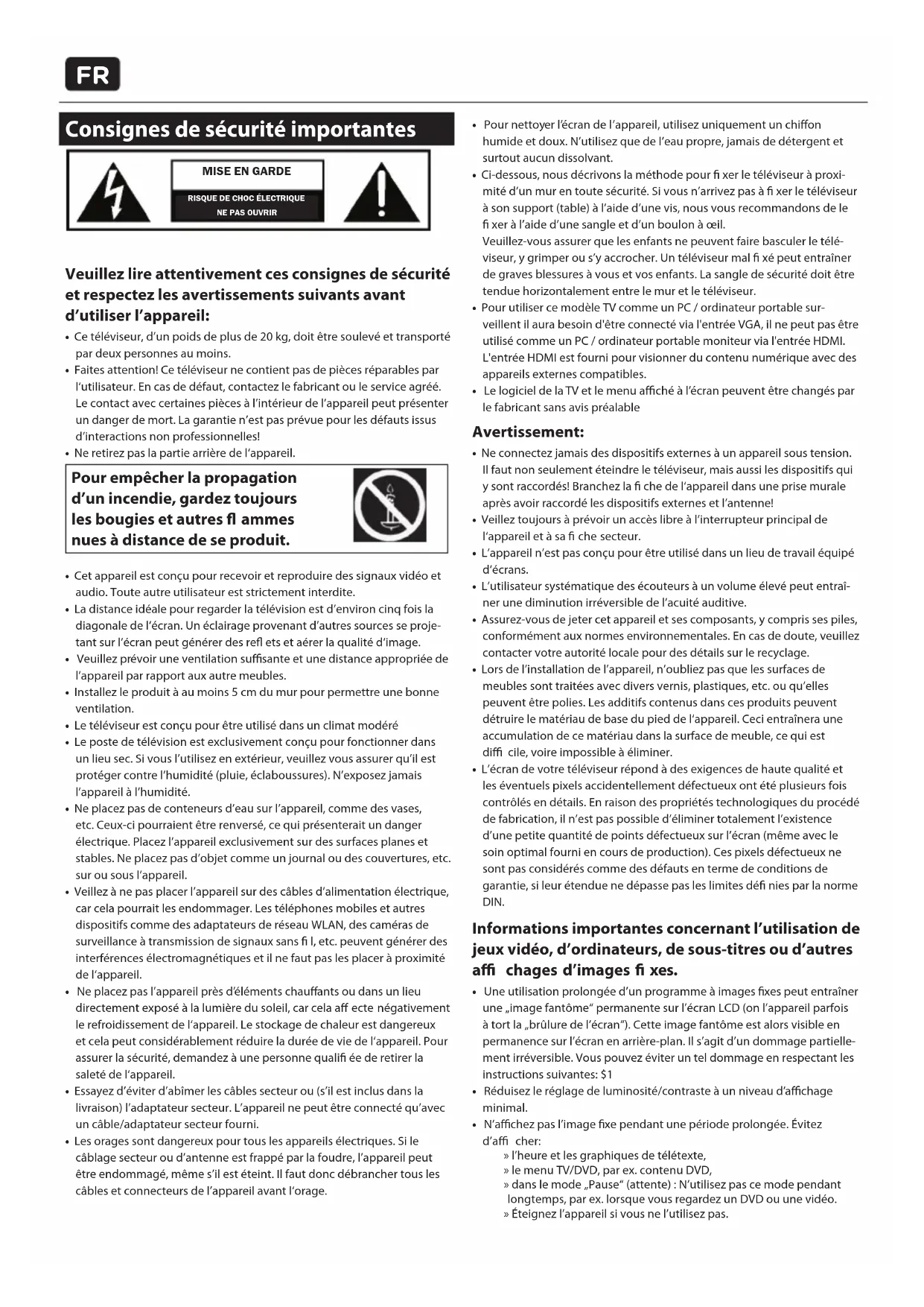- Le poste de télévision est exclusivement conçu pour fonctionner dans un lieu sec. Si vous l’utilisez en extérieur, veuillez vous assurer qu’il est protéger contre l’humidité (pluie, éclaboussures). N’exposez jamais l’appareil à l’humidité.