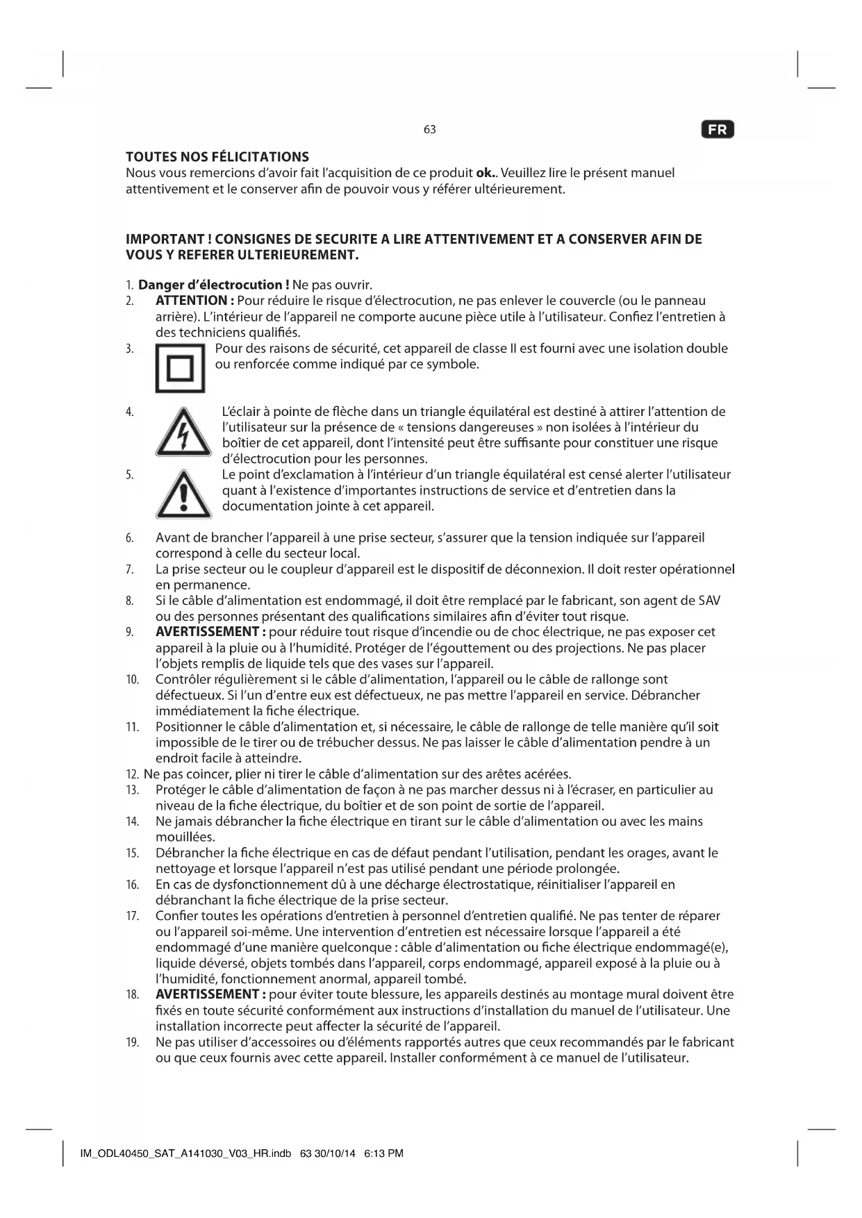 UTILISATION RECOMMANDEE Cet appareil est prévu pour la réception et la lecture des signaux audio, vidéo et de télévision. Vous devez utiliser cet appareil conformément aux présentes instructions. Tout utilisation inappropriée est dangereuse et annulera les eets de la garantie. Veuillez respecter les instructions de sécurité. IM_ODL40450_SAT_A141030_V03_HR.indb 64 30/10/14 6:13 PM65