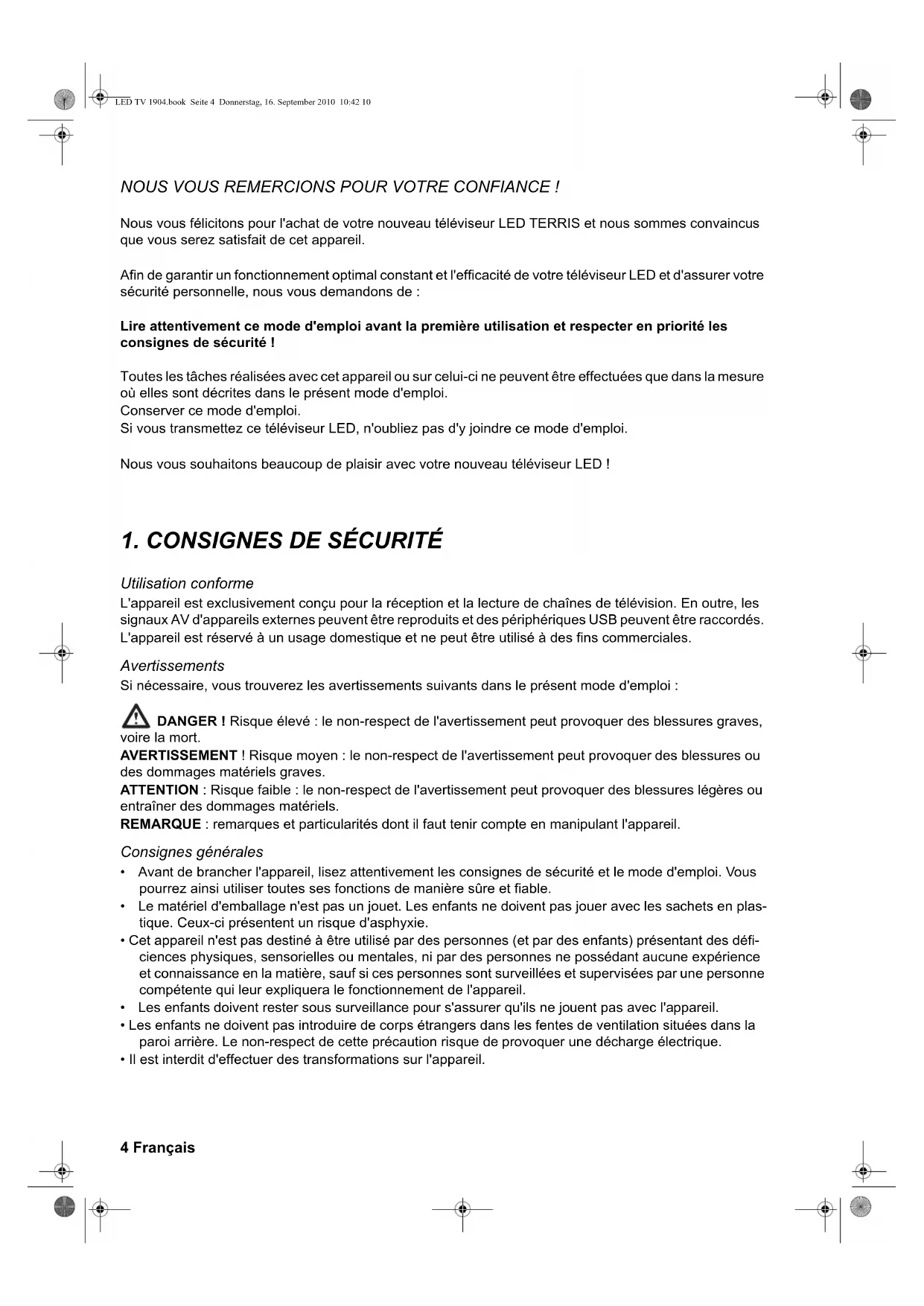 Utilisation conforme L'appareil est exclusivement conçu pour la réception et la lecture de chaînes de télévision. En outre, les signaux AV d'appareils externes peuvent être reproduits et des périphériques USB peuvent être raccordés. L'appareil est réservé à un usage domestique et ne peut être utilisé à des fins commerciales. Avertissements Si nécessaire, vous trouverez les avertissements suivants dans le présent mode d'emploi : DANGER ! Risque élevé : le non-respect de l'avertissement peut provoquer des blessures graves, voire la mort. AVERTISSEMENT ! Risque moyen : le non-respect de l'avertissement peut provoquer des blessures ou des dommages matériels graves. ATTENTION : Risque faible : le non-respect de l'avertissement peut provoquer des blessures légères ou entraîner des dommages matériels. REMARQUE : remarques et particularités dont il faut tenir compte en manipulant l'appareil. Consignes générales