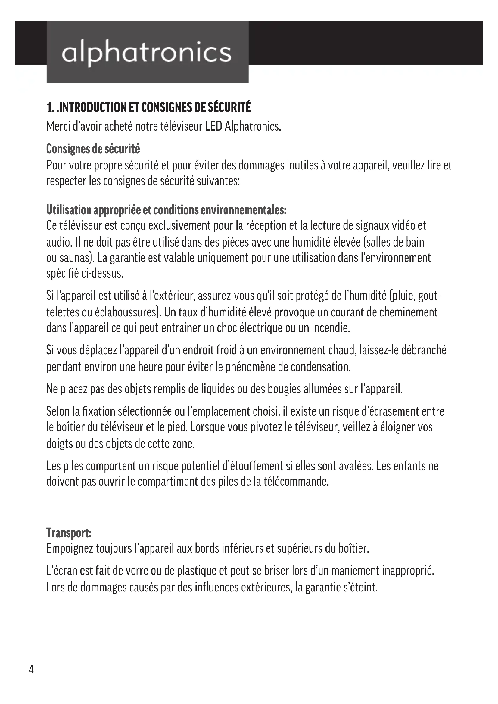 Merci d’avoir acheté notre téléviseur LED Alphatronics. Consignes de sécurité Pour votre propre sécurité et pour éviter des dommages inutiles à votre appareil, veuillez lire et respecter les consignes de sécurité suivantes: Utilisation appropriée et conditions environnementales: Ce téléviseur est conçu exclusivement pour la réception et la lecture de signaux vidéo et audio. Il ne doit pas être utilisé dans des pièces avec une humidité élevée (salles de bain ou saunas). La garantie est valable uniquement pour une utilisation dans l’environnement spécifié ci-dessus. Si l’appareil est utilisé à l’extérieur, assurez-vous qu’il soit protégé de l’humidité (pluie, gout- telettes ou éclaboussures). Un taux d’humidité élevé provoque un courant de cheminement dans l’appareil ce qui peut entraîner un choc électrique ou un incendie. Si vous déplacez l’appareil d’un endroit froid à un environnement chaud, laissez-le débranché pendant environ une heure pour éviter le phénomène de condensation. Ne placez pas des objets remplis de liquides ou des bougies allumées sur l’appareil. Selon la fixation sélectionnée ou l’emplacement choisi, il existe un risque d’écrasement entre le boîtier du téléviseur et le pied. Lorsque vous pivotez le téléviseur, veillez à éloigner vos doigts ou des objets de cette zone. Les piles comportent un risque potentiel d’étouffement si elles sont avalées. Les enfants ne doivent pas ouvrir le compartiment des piles de la télécommande. Transport: Empoignez toujours l’appareil aux bords inférieurs et supérieurs du boîtier. L’écran est fait de verre ou de plastique et peut se briser lors d’un maniement inapproprié. Lors de dommages causés par des influences extérieures, la garantie s’éteint.5 Alimentation électrique : Une tension incorrecte peut endommager l’appareil. Cet appareil doit être connecté au secteur avec la tension nominale indiquée sur la plaque signalétique au moyen d’un cordon 12V ou avec le cordon d’alimentation fourni. La prise d’alimentation du téléviseur doit être facilement accessible pour que l’appareil puisse être débranché à tout moment. Si vous retirez la fiche du secteur, ne tirez pas sur le cordon, mais directement sur le boîtier de la fiche. Dans le cas con- traire, les câbles à l’intérieur de la fiche peuvent être endommagés et causer un court-circuit lors du branchement ultérieur. Placez le cordon d’alimentation de sorte qu’il ne puisse pas être endommagé. Le cordon d’alimentation ne doit pas être plié ou posé sur des arêtes vives. Ne marchez pas dessus et n’y versez pas des produits chimiques – cela s’applique à tout l’appareil ! Un cordon d’alimentation dont l’isolation est endommagée peut provoquer un choc électrique ou un incendie. Circulation d’air et températures élevées : Les fentes d’aération à l’arrière de l’appareil ne doivent jamais être obstruées. Ne posez pas des journaux ou des tissus sur le téléviseur. Laissez un espace d’au moins 2 cm autour de l’appareil pour permettre à l’air de circuler librement si l’appareil est placé ou accroché dans une armoire ou posé sur une étagère. Comme tout appareil électronique, votre téléviseur en service a besoin d’air pour son refroidissement. Si la circulation d’air est obstruée, un incendie peut en résulter. Placez le téléviseur avec le pied sur une surface horizontale, plane et stable. Lorsqu’il est placé dans ou sur les meubles, l’appareil ne doit pas faire saillie. Placez l’appareil de sorte qu’il ne soit ni exposé à la lumière du soleil directe, ni au chauffage de radiateurs. Veillez à ce qu’aucune pièce métallique comme des aiguilles ou des trombones, aucun liquide, de la cire ou d’autres objets puissent tomber à travers les fentes d’aération à l’arrière à l’intérieur de l’appareil. Cela peut conduire à des courts-circuits dans l’appareil et éventuellement provo- quer un incendie. Si un objet est tombé à l’intérieur de l’appareil, débranchez-le immédiatement et appelez le service client.6 Réparations et accessoires : N’ôtez jamais le couvercle arrière du téléviseur. Faites effectuer les travaux de réparation et de service uniquement par nos techniciens de services certifiés. Nettoyage : Nettoyez le téléviseur, l’écran et la télécommande avec un chiffon doux, humide et propre et n’utilisez jamais des agents nettoyants puissants ou abrasifs. Précision concernant l’écran LED : Votre nouveau téléviseur avec affichage LED répond aux plus hautes exigences de qualité et a été vérifié sur les erreurs de pixels. Malgré le plus grand soin porté à la fabrication de l’écran, on ne peut pas exclure à 100% que des pixels puissent comporter des défauts pour des raisons technologiques. Recyclage: La directive de l’UE 2002/96 / CE règle la reprise, le traitement et le recyclage des équipements électroniques usagés. Les produits électroniques doivent donc être mis au rebus séparément. Ne jetez pas cet appareil avec les ordures ménagères ! Vous pouvez rapporter votre appareil gratuitement aux points de collecte désignés ou le rendre à votre revendeur lorsque vous achetez un nouveau téléviseur. Conformément à l’ordonnance sur les accumulateurs, les piles ne doivent pas être jetées avec les ordures ménagères. Apportez les piles usagées aux points de collecte afférents. Pour de plus amples informations, veuillez contacter les autorités locales