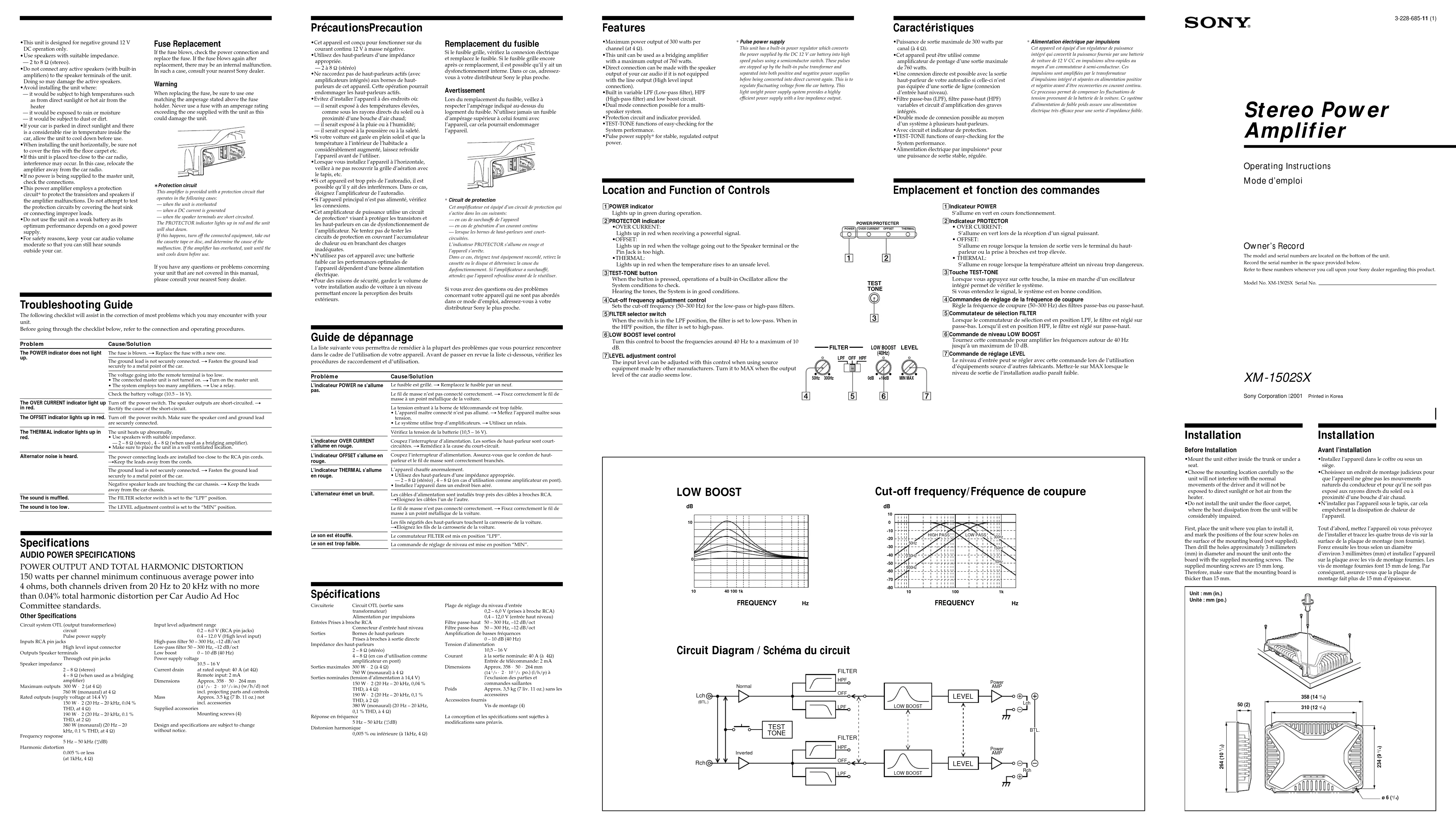 50 (2)ProblemThe POWER indicator does not light up. The OVER CURRENT indicator light upin red.The OFFSET indicator lights up in red.The THERMAL indicator lights up in red. Alternator noise is heard.The sound is muffled.The sound is too low. Sony Corporation 2001 Printed in Korea XM-1502SX Owner’s Record The model and serial numbers are located on the bottom of the unit.Record the serial number in the space provided below.Refer to these numbers whenever you call upon your Sony dealer regarding this product.Model No. XM-1502SX Serial No.•This unit is designed for negative ground 12 VDC operation only. Use speakers with suitable impedance.— 2 to 8 Ω (stereo).•Do not connect any active speakers (with built-inamplifiers) to the speaker terminals of the unit.Doing so may damage the active speakers.•Avoid installing the unit where:— it would be subject to high temperatures suchas from direct sunlight or hot air from theheater— it would be exposed to rain or moisture— it would be subject to dust or dirt.•If your car is parked in direct sunlight and thereis a considerable rise in temperature inside thecar, allow the unit to cool down before use.•When installing the unit horizontally, be sure notto cover the fins with the floor carpet etc.•If this unit is placed too close to the car radio,interference may occur. In this case, relocate theamplifier away from the car radio.•If no power is being supplied to the master unit,check the connections.•This power amplifier employs a protectioncircuit* to protect the transistors and speakers ifthe amplifier malfunctions. Do not attempt to testthe protection circuits by covering the heat sinkor connecting improper loads.•Do not use the unit on a weak battery as itsoptimum performance depends on a good powersupply.•For safety reasons, keep your car audio volumemoderate so that you can still hear soundsoutside your car. PrécautionsPrecaution Fuse Replacement If the fuse blows, check the power connection andreplace the fuse. If the fuse blows again afterreplacement, there may be an internal malfunction.In such a case, consult your nearest Sony dealer.WarningWhen replacing the fuse, be sure to use onematching the amperage stated above the fuseholder. Never use a fuse with an amperage ratingexceeding the one supplied with the unit as thiscould damage the unit.∗Protection circuitThis amplifier is provided with a protection circuit thatoperates in the following cases:— when the unit is overheated— when a DC current is generated— when the speaker terminals are short circuited.The PROTECTOR indicator lights up in red and the unitwill shut down.If this happens, turn off the connected equipment, take outthe cassette tape or disc, and determine the cause of themalfunction. If the amplifier has overheated, wait until theunit cools down before use.If you have any questions or problems concerningyour unit that are not covered in this manual,please consult your nearest Sony dealer.•Cet appareil est conçu pour fonctionner sur ducourant continu 12 V à masse négative.•Utilisez des haut-parleurs d’une impédanceappropriée.— 2 à 8 Ω (stéréo)•Ne raccordez pas de haut-parleurs actifs (avecamplificateurs intégrés) aux bornes de haut-parleurs de cet appareil. Cette opération pourraitendommager les haut-parleurs actifs.•Evitez d’installer l’appareil à des endroits où:— il serait exposé à des températures élevées,comme sous les rayons directs du soleil ou àproximité d’une bouche d’air chaud;— il serait exposé à la pluie ou à l’humidité;— il serait exposé à la poussière ou à la saleté.•Si votre voiture est garée en plein soleil et que latempérature à l’intérieur de l’habitacle aconsidérablement augmenté, laissez refroidirl’appareil avant de l’utiliser.•Lorsque vous installez l’appareil à l’horizontale,veillez à ne pas recouvrir la grille d’aération avecle tapis, etc.•Si cet appareil est trop près de l’autoradio, il estpossible qu’il y ait des interférences. Dans ce cas,éloignez l’amplificateur de l’autoradio.•Si l’appareil principal n’est pas alimenté, vérifiezles connexions.•Cet amplificateur de puissance utilise un circuitde protection* visant à protéger les transistors etles haut-parleurs en cas de dysfonctionnement del’amplificateur. Ne tentez pas de tester lescircuits de protection en couvrant l’accumulateurde chaleur ou en branchant des chargesinadéquates.•N’utilisez pas cet appareil avec une batteriefaible car les performances optimales del’appareil dépendent d’une bonne alimentationélectrique.•Pour des raisons de sécurité, gardez le volume devotre installation audio de voiture à un niveaupermettant encore la perception des bruitsextérieurs. Remplacement du fusible Si le fusible grille, vérifiez la connexion électriqueet remplacez le fusible. Si le fusible grille encoreaprès ce remplacement, il est possible qu’il y ait undysfonctionnement interne. Dans ce cas, adressez-vous à votre distributeur Sony le plus proche.AvertissementLors du remplacement du fusible, veillez àrespecter l’ampérage indiqué au-dessus dulogement du fusible. N’utilisez jamais un fusibled’ampérage supérieur à celui fourni avecl’appareil, car cela pourrait endommagerl’appareil.* Circuit de protectionCet amplificateur est équipé d’un circuit de protection quis’active dans les cas suivants:— en cas de surchauffe de l’appareil— en cas de génération d’un courant continu— lorsque les bornes de haut-parleurs sont court-circuitées.L’indicateur PROTECTOR s’allume en rouge etl’appareil s’arrête.Dans ce cas, éteignez tout équipement raccordé, retirez lacassette ou le disque et déterminez la cause dudysfonctionnement. Si l’amplificateur a surchauffé,attendez que l’appareil refroidisse avant de le réutiliser.Si vous avez des questions ou des problèmesconcernant votre appareil qui ne sont pas abor