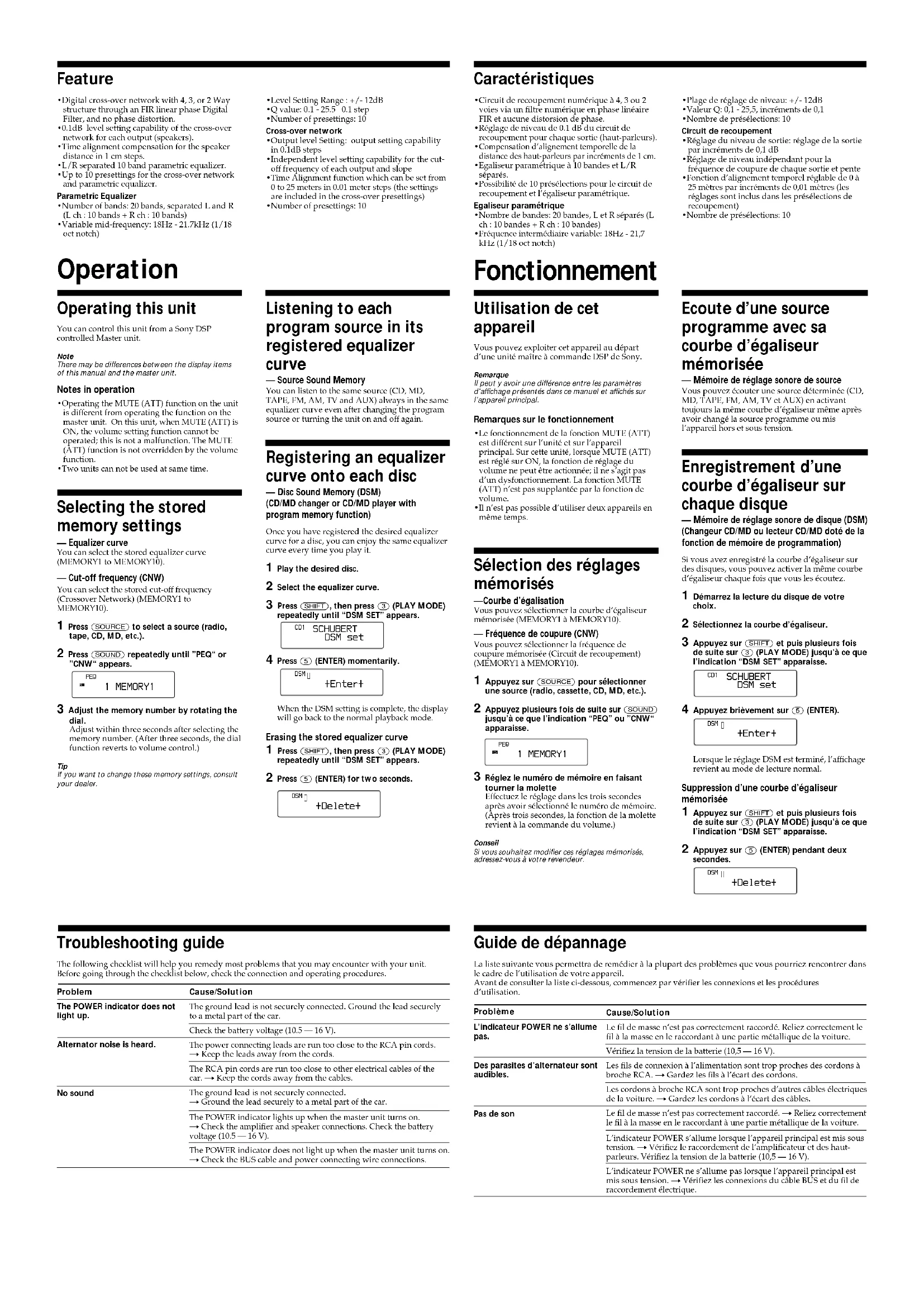 - Operating the MUTE (ATT) function on the unitis different from operating the function on themaster unit. On this unit, when MUTE (ATT) isON, the volume setting function cannot beoperated; this is not a malfunction. The MUTE(ATT) function is not overridden by the volumefunction.•Two units can not be used at same time. Selecting the stored memory settings — Equalizer curve You can select the stored equalizer curve(MEMORY1 to MEMORY10). — Cut-off frequency (CNW) You can select the stored cut-off frequency(Crossover Network) (MEMORY1 toMEMORY10). 1 Press (SOURCE) to select a source (radio, tape, CD, MD, etc.). 2 Press (SOUND) repeatedly until ”PEQ“ or ”CNW“ appears. 3 Adjust the memory number by rotating the dial.Adjust within three seconds after selecting thememory number. (After three seconds, the dialfunction reverts to volume control.) Tip If you want to change these memory settings, consultyour dealer. Utilisation de cet appareil Vous pouvez exploiter cet appareil au départd’une unité maître à commande DSP de Sony.RemarqueIl peut y avoir une différence entre les paramètresd’affichage présentés dans ce manuel et affichés surl’appareil principal. Remarques sur le fonctionnement