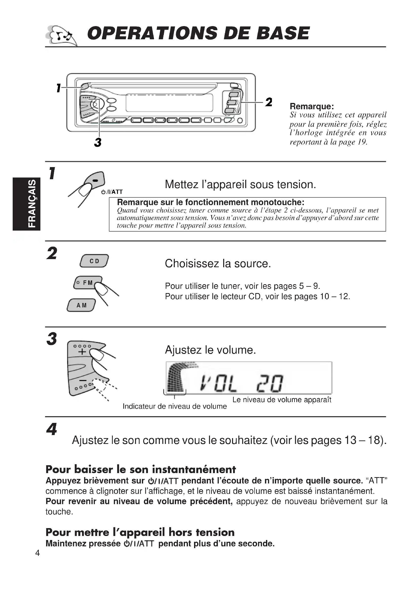 Ajustez le son comme vous le souhaitez (voir les pages 13 – 18). Pour baisser le son instantanément Appuyez brièvement sur pendant l’écoute de n’importe quelle source. “ATT”commence à clignoter sur l’affichage, et le niveau de volume est baissé instantanément.Pour revenir au niveau de volume précédent, appuyez de nouveau brièvement sur latouche. Pour mettre l’appareil hors tension Maintenez pressée pendant plus d’une seconde.