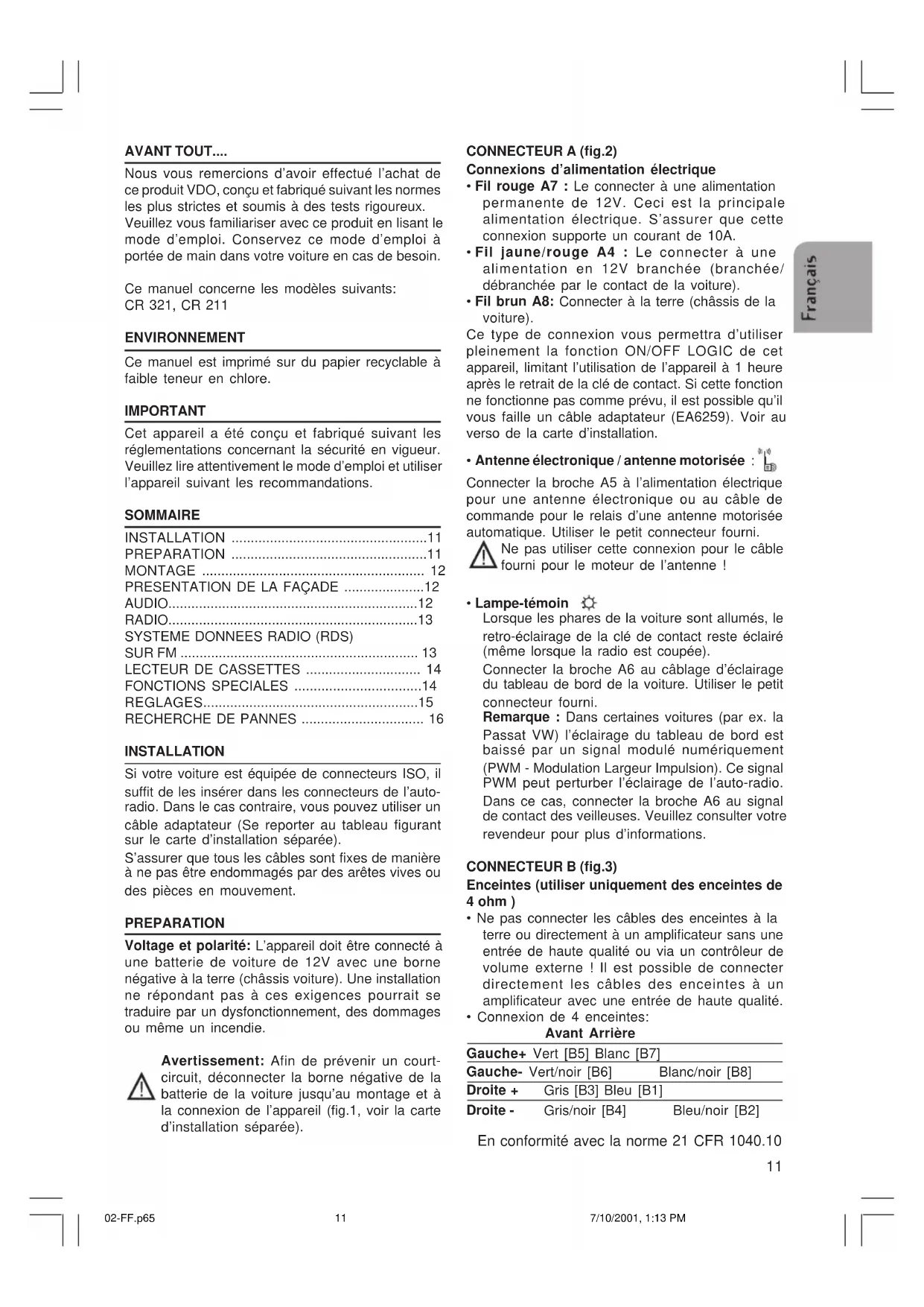 MODE D'EMPLOI CD 441 VDO DAYTON