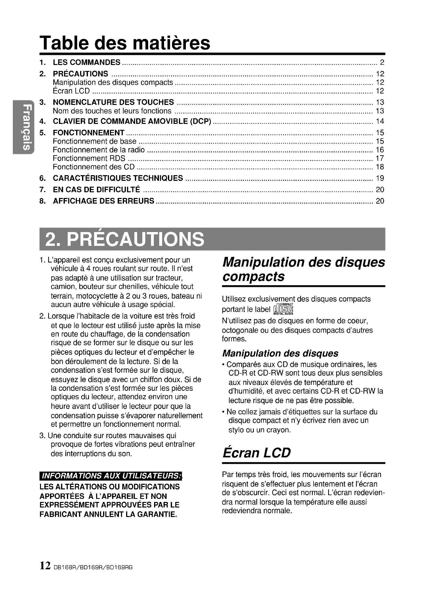 - Comparés aux CD de musique ordinaires, lesCD-R et CD-RW sont tous deux plus sensiblesaux niveaux élevés de température etd’humidité, et avec certains CD-R et CD-RW lalecture risque de ne pas être possible.• Ne collez jamais d’étiquettes sur la surface dudisque compact et n’y écrivez rien avec unstylo ou un crayon. Écran LCD Par temps très froid, les mouvements sur l’écranrisquent de s’effectuer plus lentement et l’écrande s’obscurcir. Ceci est normal. L’écran redevien-dra normal lorsque la température elle aussiredeviendra normale.280-8304-00 Français DB168R/BD169R/BD169RG 13