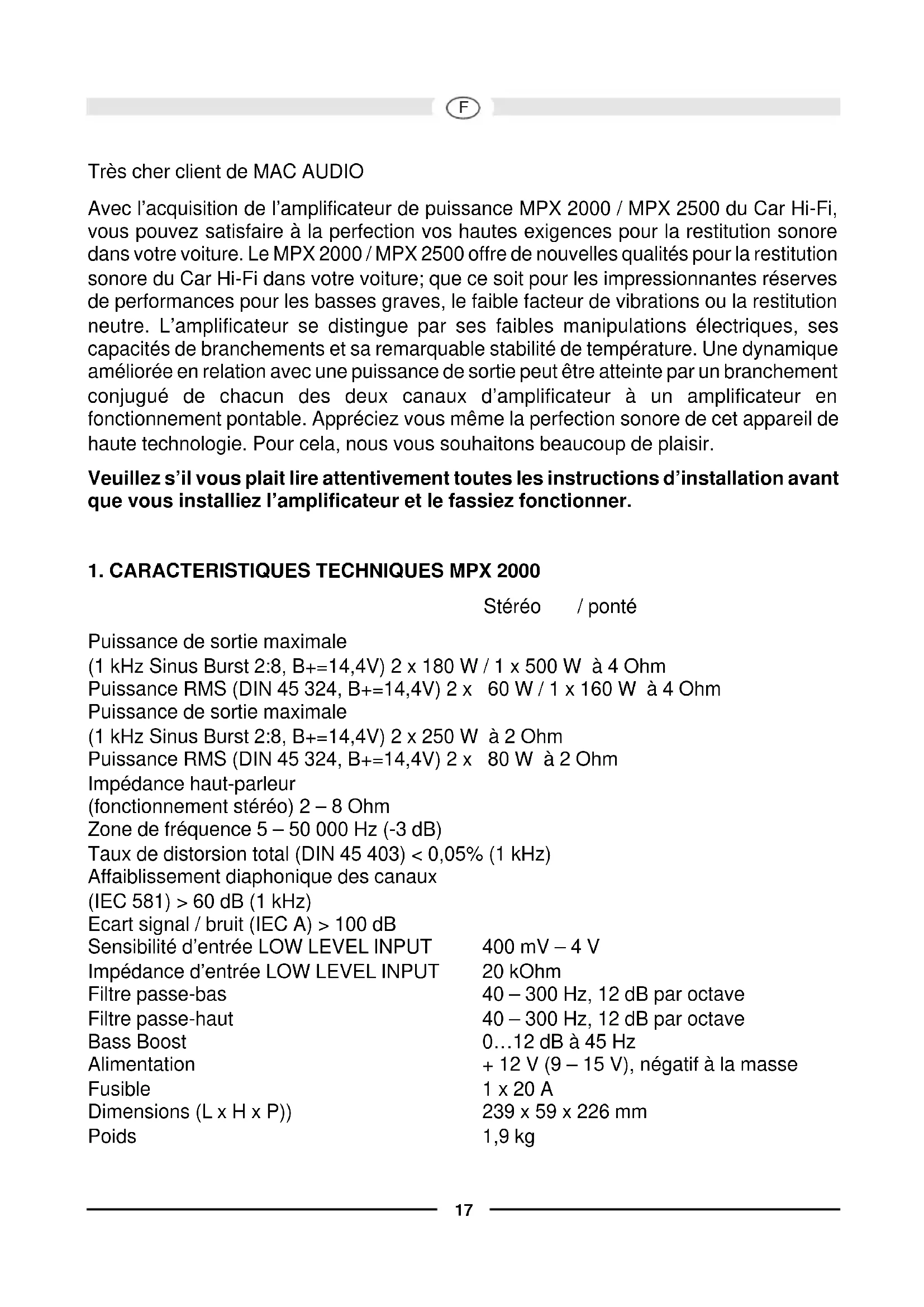 Très cher client de MAC AUDIO Avec l’acquisition de l’amplificateur de puissance MPX 2000 / MPX 2500 du Car Hi-Fi, vous pouvez satisfaire à la perfection vos hautes exigences pour la restitution sonore dans votre voiture. Le MPX 2000 / MPX 2500 offre de nouvelles qualités pour la restitution sonore du Car Hi-Fi dans votre voiture; que ce soit pour les impressionnantes réserves de performances pour les basses graves, le faible facteur de vibrations ou la restitution neutre. L’amplificateur se distingue par ses faibles manipulations électriques, ses capacités de branchements et sa remarquable stabilité de température. Une dynamique améliorée en relation avec une puissance de sortie peut être atteinte par un branchement conjugué de chacun des deux canaux d’amplificateur à un amplificateur en fonctionnement pontable. Appréciez vous même la perfection sonore de cet appareil de haute technologie. Pour cela, nous vous souhaitons beaucoup de plaisir. Veuillez s’il vous plait lire attentivement toutes les instructions d’installation avant que vous installiez l’amplificateur et le fassiez fonctionner.