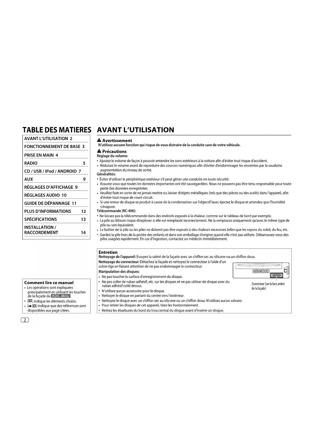 2500 mV/10k Impédance du préamplificateur ≤600 Auxiliaire Réponse en fréquence (±3 dB) 20Hz—20kHz Tension maximum d’entrée 1000 mV Impédance d’entrée 30k Généralités Tension de fonctionnement 14,4V (10,5 V — 16V admissible) Consommation de courant maximale 10A Plage de températures de fonctionnement 0°C à +40°C Dimensions d’installation (L × H × P) 182 mm×53 mm×159mm Poids 1,2 kg Sujet à changement sans notification. JS_KWD_KDC_364U_102UR_EN_FR.indd 13JS_KWD_KDC_364U_102UR_EN_FR.indd 13 20-Oct-14 2:23:21 PM20-Oct-14 2:23:21 PM14 Data Size: B6L (182 mm x 128 mm) Book Size: B6L (182 mm x 128 mm) INSTALLATION / RACCORDEMENT Avertissement