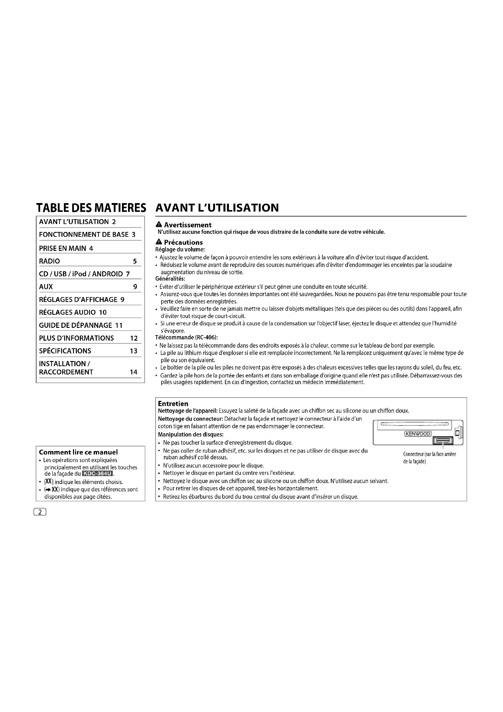 Retirez les ébarbures du bord du trou central du disque avant d’insérer un disque. Connecteur (sur la face arrière de la façade) JS_KWD_KDC_364U_FR.indd 2JS_KWD_KDC_364U_FR.indd 2 18/7/2014 4:04:52 PM18/7/2014 4:04:52 PMData Size: B6L (182 mm x 128 mm) Book Size: B6L (182 mm x 128 mm)