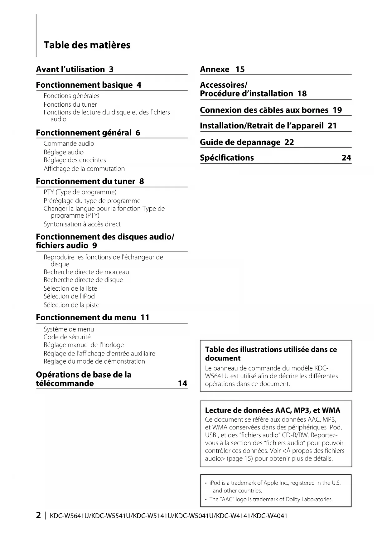 - iPod is a trademark of Apple Inc., registered in the U.S. and other countries.• The “AAC” logo is trademark of Dolby Laboratories. Avant l’utilisation 3 Fonctionnement basique 4 Fonctions générales Fonctions du tuner Fonctions de lecture du disque et des fichiers audio Fonctionnement général 6 Commande audio Réglage audio Réglage des enceintes Affichage de la commutation Fonctionnement du tuner 8 PTY (Type de programme) Préréglage du type de programme Changer la langue pour la fonction Type de programme (PTY) Syntonisation à accès direct Fonctionnement des disques audio/ fichiers audio 9 Reproduire les fonctions de l'échangeur de disque Recherche directe de morceau Recherche directe de disque Sélection de la liste Sélection de l'iPod Sélection de la piste Fonctionnement du menu 11 Système de menu Code de sécurité Réglage manuel de l’horloge Réglage de l’affichage d’entrée auxiliaire Réglage du mode de démonstration Opérations de base de la télécommande 14