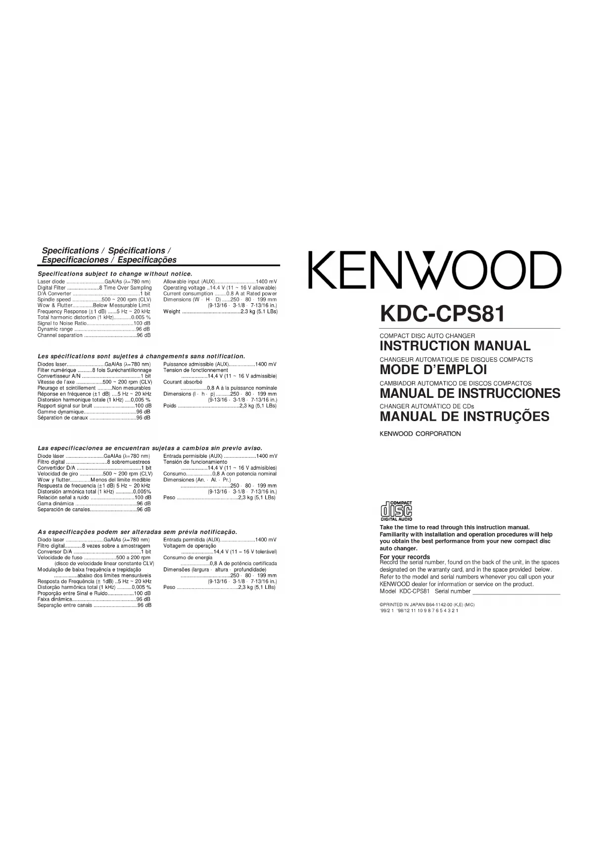 Retrouvez gratuitement la notice de l'appareil KDCCPS81 KENWOOD au format PDF.