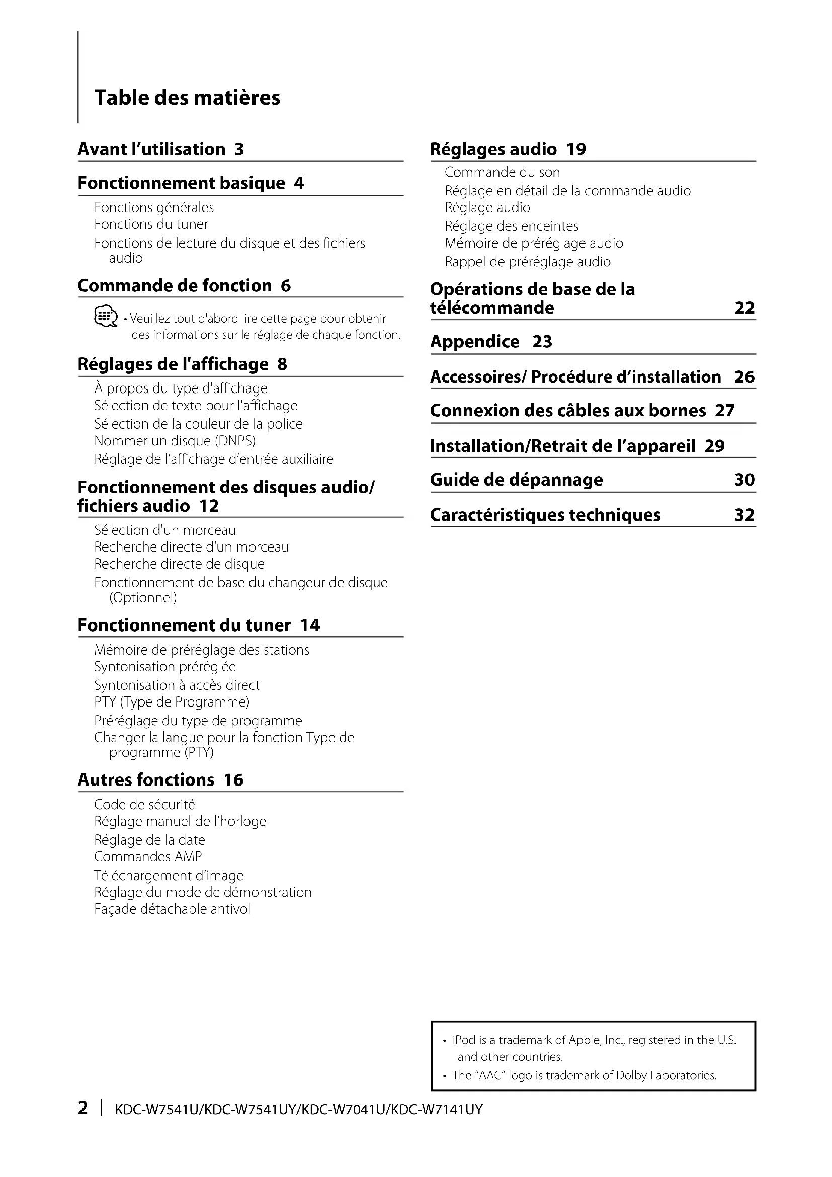 - iPod is a trademark of Apple, Inc., registered in the U.S. and other countries.• The “AAC” logo is trademark of Dolby Laboratories. Avant l’utilisation 3 Fonctionnement basique 4 Fonctions générales Fonctions du tuner Fonctions de lecture du disque et des fichiers audio Commande de fonction 6 ⁄ • Veuillez tout d'abord lire cette page pour obtenir des informations sur le réglage de chaque fonction. Réglages de l'affichage 8 À propos du type d'affichage Sélection de texte pour l'affichage Sélection de la couleur de la police Nommer un disque (DNPS) Réglage de l’affichage d’entrée auxiliaire Fonctionnement des disques audio/ fichiers audio 12 Sélection d'un morceau Recherche directe d'un morceau Recherche directe de disque Fonctionnement de base du changeur de disque (Optionnel) Fonctionnement du tuner 14 Mémoire de préréglage des stations Syntonisation préréglée Syntonisation à accès direct PTY (Type de Programme) Préréglage du type de programme Changer la langue pour la fonction Type de programme (PTY) Autres fonctions 16 Code de sécurité Réglage manuel de l’horloge Réglage de la date Commandes AMP Téléchargement d’image Réglage du mode de démonstration Façade détachable antivol Réglages audio 19 Commande du son Réglage en détail de la commande audio Réglage audio Réglage des enceintes Mémoire de préréglage audio Rappel de préréglage audio Opérations de base de la télécommande 22 Appendice 23 Accessoires/ Procédure d’installation