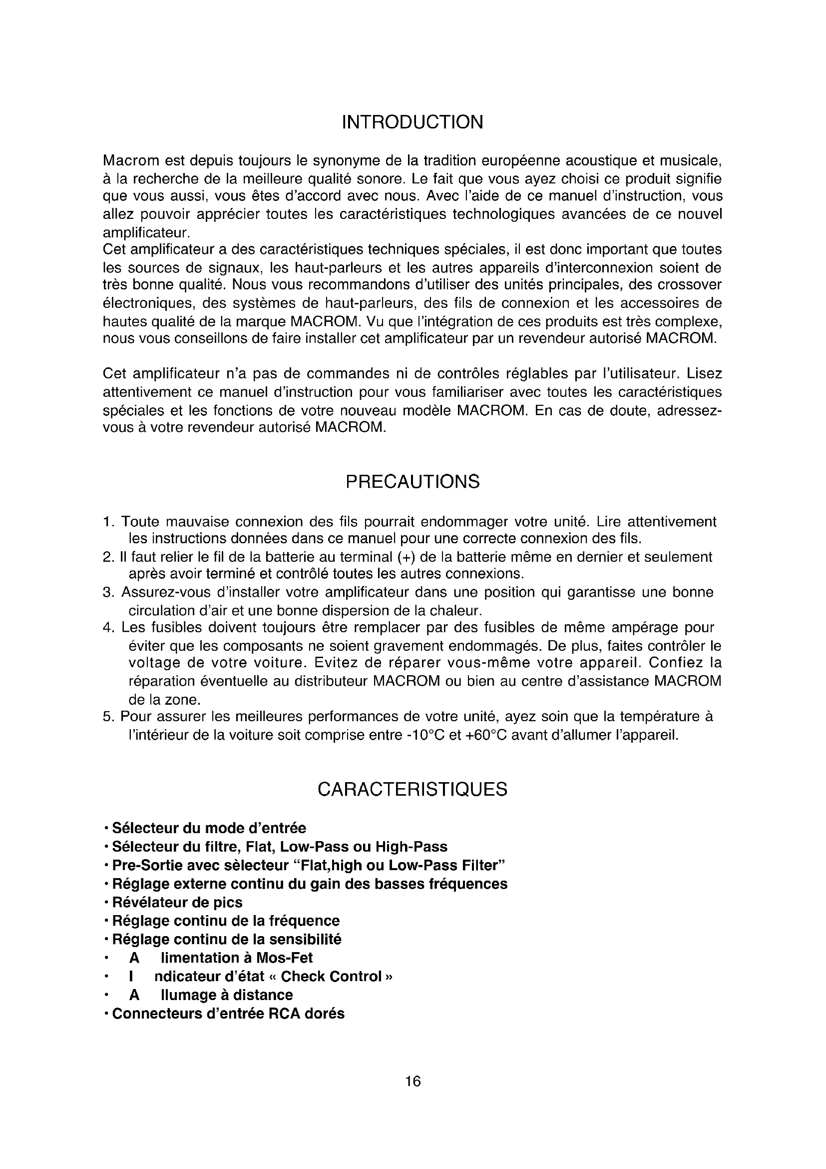 Bridged 3-channel configuration 2-channel configuration 1-channel configuration O/M ST 2.100 25/06/02 18:28 Page 1415 TECHNISCHE DATEN Leistung IHF 202 500W RMS-Leistung bei (12,5 Volt DC) bei 1 kHz < 0,08 % THD+N bei 4 Ohm 2 x 100W bei 1 kHz < 0,5 % THD+N bei 2 Ohm 2 x 200W bei 1 kHz < 0,5 % THD+N Mono bei 4 Ohm 1 x 400W Vorausgangsempfindlichkeit 2V Hochpaß-Einstellung (30-600)Hz Tiefpaß-Einstellung (30-600)Hz Flankensteilheit 12 dB/Oktave Frequenzgang +1 dB 10-50.000 Hz Harmonische Verzerrung, gesamt 0,08% Rauschabstand, IHF A-gewichtet > 100 dB Eingangsempfindlichkeit – Impedanz 200-4000 mV/22 kOhm Lautsprecherimpedanz Stereo min. 1 Ohm Mono min. 2 Ohm Stromversorgung 14,4 V DC (11 - 16 V zulässig) Gewicht 4,7 kg Maß 212(L) x 67(H) x 405(T) mm Änderungen der technischen Daten und des Design bleiben zwecks Verbesserung vorbehalten. O/M ST 2.100 25/06/02 18:28 Page 1516 INTRODUCTION Macrom est depuis toujours le synonyme de la tradition européenne acoustique et musicale, à la recherche de la meilleure qualité sonore. Le fait que vous ayez choisi ce produit signifie que vous aussi, vous êtes d’accord avec nous. Avec l’aide de ce manuel d’instruction, vous allez pouvoir apprécier toutes les caractéristiques technologiques avancées de ce nouvel amplificateur. Cet amplificateur a des caractéristiques techniques spéciales, il est donc important que toutes les sources de signaux, les haut-parleurs et les autres appareils d’interconnexion soient de très bonne qualité. Nous vous recommandons d’utiliser des unités principales, des crossover électroniques, des systèmes de haut-parleurs, des fils de connexion et les accessoires de hautes qualité de la marque MACROM. Vu que l’intégration de ces produits est très complexe, nous vous conseillons de faire installer cet amplificateur par un revendeur autorisé MACROM. Cet amplificateur n’a pas de commandes ni de contrôles réglables par l’utilisateur. Lisez attentivement ce manuel d’instruction pour vous familiariser avec toutes les caractéristiques spéciales et les fonctions de votre nouveau modèle MACROM. En cas de doute, adressez- vous à votre revendeur autorisé MACROM. PRECAUTIONS