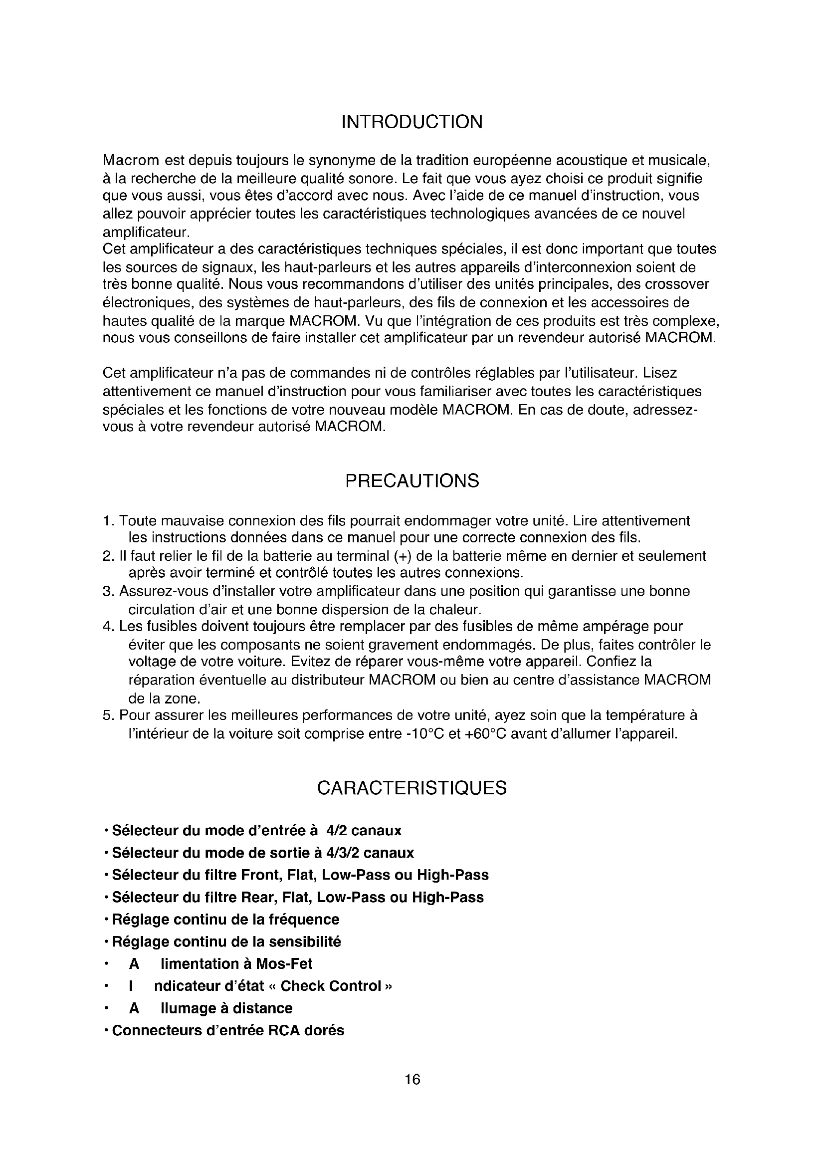 Bridged Front Rear 3-channel configuration 2-channel configuration 1-channel configuration O/M SP 4.050 25/06/02 18:17 Page 1415 TECHNISCHE DATEN Leistung IHF 202 500 W RMS-Leistung bei (12,5 Volt DC) Front/Rear bei 1 kHz < 0,08 % THD bei 4 Ohm 4 x 45W Front/Rear bei 1 kHz < 0,5 % THD bei 2 Ohm 4 x 80W Front/Rear bei 1 kHz < 0,5 % THD Mono bei 4 Ohm 2 x 140W Dynamische Leistung bei (14,4 Volt DC) Front/Rear bei 1 kHz < 0,08 % THD bei 4 Ohm 4 x 60W Front/Rear bei 1 kHz < 0,5 % THD bei 2 Ohm 4 x 90W Front/Rear bei 1 kHz < 0,5 % THD Mono bei 4 Ohm 2 x 180W Hochpaß, Front und Rear (30-600)Hz Tiefpaß, Front e Rear (30-600)Hz Flankensteilheit 12 dB/Oktave Frequenzgang +1 dB 10-50.000 Hz Harmonische Verzerrung, gesamt 0,08% Rauschabstand, IHF A-gewägt >90 dB Eingangsempfindlichkeit – Impedanz 200-4000 mV/22 kOhm Lautsprecherimpedanz Stereo min. 2 Ohm Mono min. 4 Ohm Stromversorgung 14,4 V DC (11 - 16 V zulässig) Gewicht 3,9 kg Maß 212(l) x 65(h) x 355(t) mm Änderungen der technischen Daten und des Design bleiben zwecks Verbesserung vorbehalten. O/M SP 4.050 25/06/02 18:17 Page 1516 INTRODUCTION Macrom est depuis toujours le synonyme de la tradition européenne acoustique et musicale, à la recherche de la meilleure qualité sonore. Le fait que vous ayez choisi ce produit signifie que vous aussi, vous êtes d’accord avec nous. Avec l’aide de ce manuel d’instruction, vous allez pouvoir apprécier toutes les caractéristiques technologiques avancées de ce nouvel amplificateur. Cet amplificateur a des caractéristiques techniques spéciales, il est donc important que toutes les sources de signaux, les haut-parleurs et les autres appareils d’interconnexion soient de très bonne qualité. Nous vous recommandons d’utiliser des unités principales, des crossover électroniques, des systèmes de haut-parleurs, des fils de connexion et les accessoires de hautes qualité de la marque MACROM. Vu que l’intégration de ces produits est très complexe, nous vous conseillons de faire installer cet amplificateur par un revendeur autorisé MACROM. Cet amplificateur n’a pas de commandes ni de contrôles réglables par l’utilisateur. Lisez attentivement ce manuel d’instruction pour vous familiariser avec toutes les caractéristiques spéciales et les fonctions de votre nouveau modèle MACROM. En cas de doute, adressez- vous à votre revendeur autorisé MACROM. PRECAUTIONS