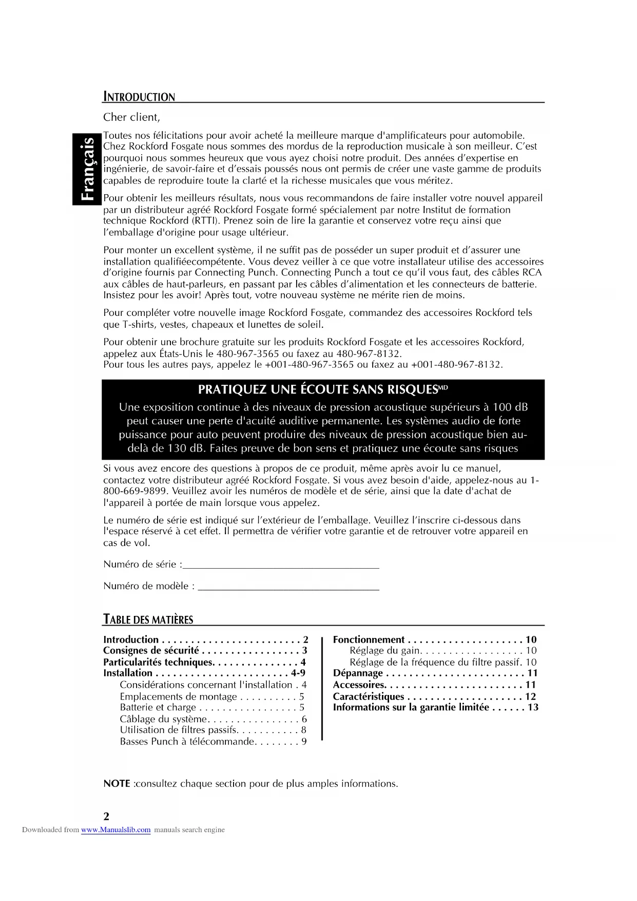 Toutes nos félicitations pour avoir acheté la meilleure marque d'amplificateurs pour automobile. Chez Rockford Fosgate nous sommes des mordus de la reproduction musicale à son meilleur. C'est pourquoi nous sommes heureux que vous ayez choisi notre produit. Des années d'expertise en ingénierie, de savoir-faire et d'essais poussés nous ont permis de créer une vaste gamme de produits capables de reproduire toute la clarté et la richesse musicales que vous méritez.