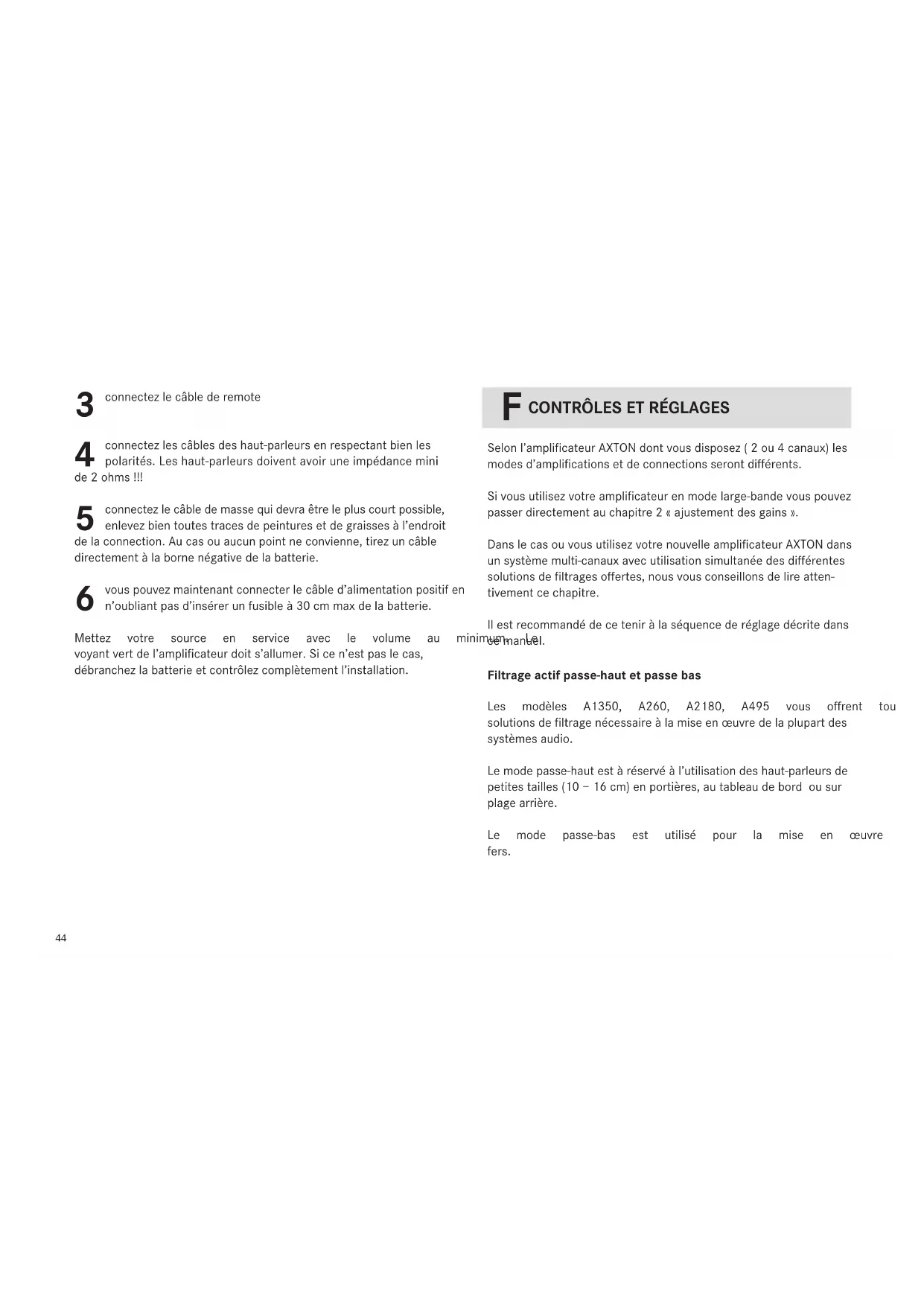 Selonl’amplificateurAXTONdontvousdisposez(2ou4canaux)les modesd’amplificationsetdeconnectionsserontdifférents. Sivousutilisezvotreamplificateurenmodelarge-bandevouspouvez passerdirectementauchapitre2«ajustementdesgains». DanslecasouvousutilisezvotrenouvelleamplificateurAXTONdans unsystèmemulti-canauxavecutilisationsimultanéedesdifférentes solutionsdefiltragesoffertes,nousvousconseillonsdelireatten- tivementcechapitre. Ilestrecommandédeceteniràlaséquencederéglagedécritedans cemanuel.