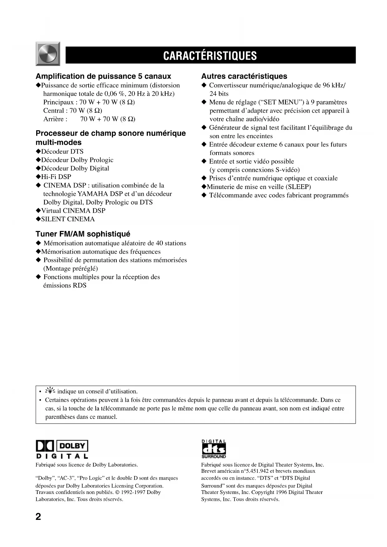 CARACTÉRISTIQUES Fabriqué sous licence de Dolby Laboratories. “Dolby”, “AC-3”, “Pro Logic” et le double D sont des marques déposées par Dolby Laboratories Licensing Corporation. Travaux confidentiels non publiés. © 1992-1997 Dolby Laboratories, Inc. Tous droits réservés. Fabriqué sous licence de Digital Theater Systems, Inc. Brevet américain n°5.451.942 et brevets mondiaux accordés ou en instance. “DTS” et “DTS Digital Surround” sont des marques déposées par Digital Theater Systems, Inc. Copyright 1996 Digital TheaterSystems, Inc. Tous droits réservés. Amplification de puissance 5 canaux ◆ Puissance de sortie efficace minimum (distorsion harmonique totale de 0,06 %, 20 Hz à 20 kHz) Principaux : 70 W + 70 W (8 Ω) Central : 70 W (8 Ω) Arrière : 70 W + 70 W (8 Ω) Processeur de champ sonore numérique multi-modes ◆ Décodeur DTS ◆ Décodeur Dolby Prologic ◆ Décodeur Dolby Digital ◆ Hi-Fi DSP ◆ CINEMA DSP : utilisation combinée de la technologie YAMAHA DSP et d’un décodeur Dolby Digital, Dolby Prologic ou DTS ◆ Virtual CINEMA DSP ◆ SILENT CINEMA Tuner FM/AM sophistiqué ◆ Mémorisation automatique aléatoire de 40 stations ◆ Mémorisation automatique des fréquences ◆ Possibilité de permutation des stations mémorisées (Montage préréglé) ◆ Fonctions multiples pour la réception des émissions RDS Autres caractéristiques ◆ Convertisseur numérique/analogique de 96 kHz/ 24 bits ◆ Menu de réglage (“SET MENU”) à 9 paramètres permettant d’adapter avec précision cet appareil à votre chaîne audio/vidéo ◆ Générateur de signal test facilitant l’équilibrage du son entre les enceintes ◆ Entrée décodeur externe 6 canaux pour les futurs formats sonores ◆ Entrée et sortie vidéo possible (y compris connexions S-vidéo) ◆ Prises d’entrée numérique optique et coaxiale ◆ Minuterie de mise en veille (SLEEP) ◆ Télécommande avec codes fabricant programmés