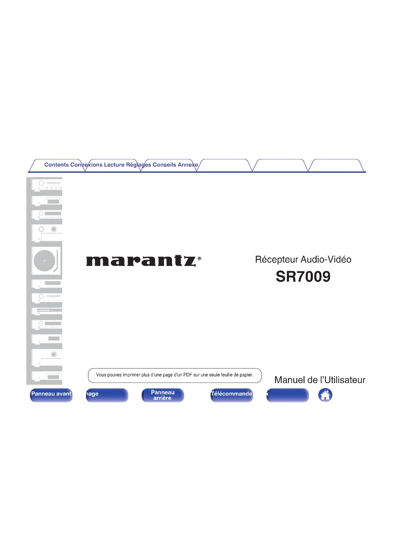 Récepteur Audio-Vidéo SR7009 Manuel de l’Utilisateur Vous pouvez imprimer plus d’une page d’un PDF sur une seule feuille de papier. Contents Connexions Lecture Réglages Conseils Annexe