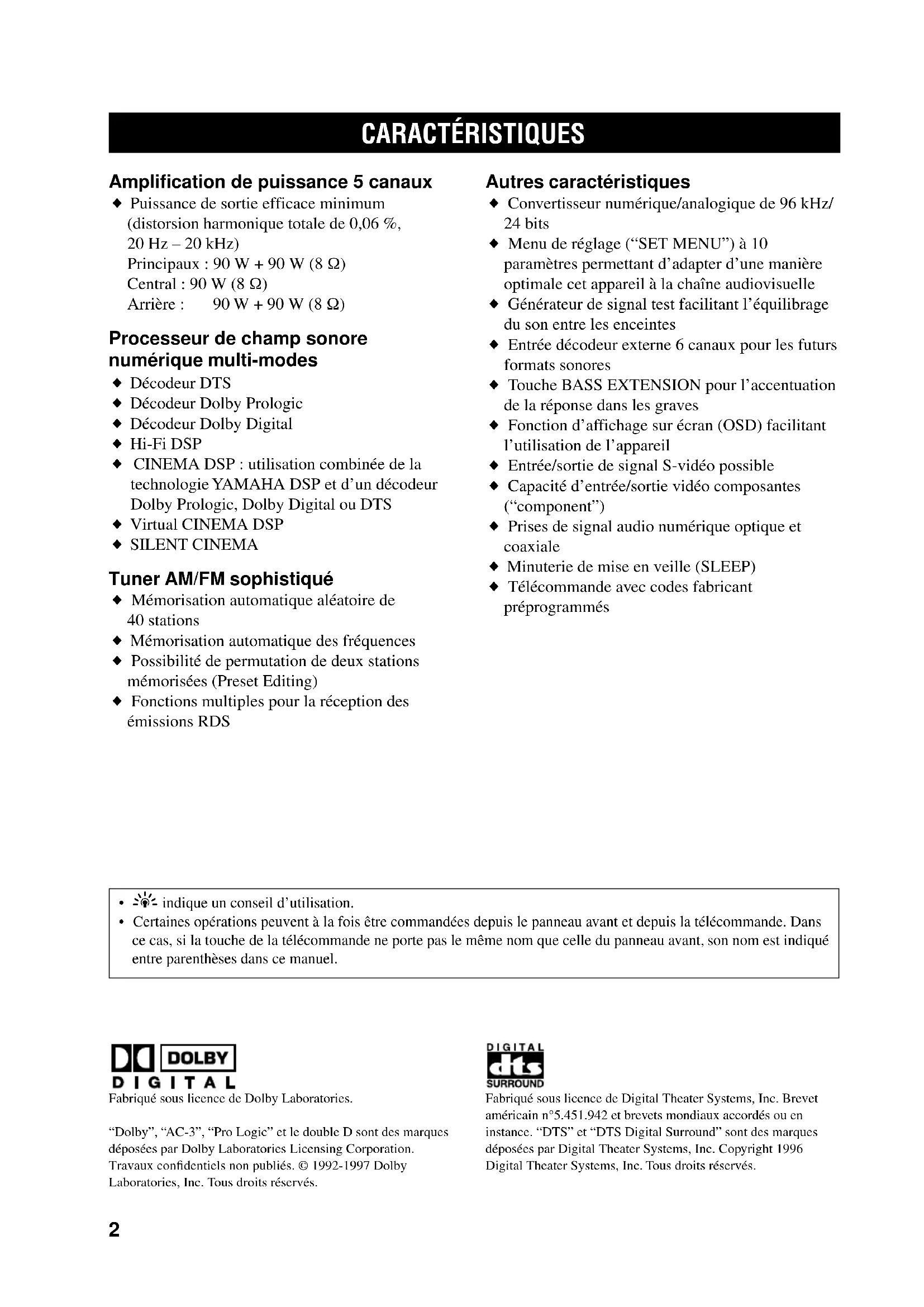 - Certaines opérations peuvent à la fois être commandées depuis le panneau avant et depuis la télécommande. Dans ce cas, si la touche de la télécommande ne porte pas le même nom que celle du panneau avant, son nom est indiqué entre parenthèses dans ce manuel. Amplification de puissance 5 canaux ◆ Puissance de sortie efficace minimum (distorsion harmonique totale de 0,06 %, 20 Hz – 20 kHz) Principaux : 90 W + 90 W (8 Ω) Central : 90 W (8 Ω) Arrière : 90 W + 90 W (8 Ω) Processeur de champ sonore numérique multi-modes ◆ Décodeur DTS ◆ Décodeur Dolby Prologic ◆ Décodeur Dolby Digital ◆ Hi-Fi DSP ◆ CINEMA DSP : utilisation combinée de la technologie YAMAHA DSP et d’un décodeur Dolby Prologic, Dolby Digital ou DTS ◆ Virtual CINEMA DSP ◆ SILENT CINEMA Tuner AM/FM sophistiqué ◆ Mémorisation automatique aléatoire de 40 stations ◆ Mémorisation automatique des fréquences ◆ Possibilité de permutation de deux stations mémorisées (Preset Editing) ◆ Fonctions multiples pour la réception des émissions RDS