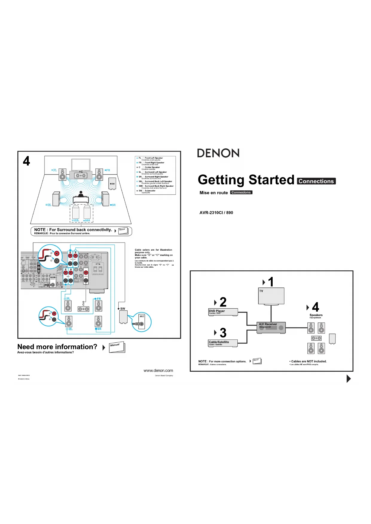 DVD Player Cable/SatelliteNOTE : For more connection options.Câble / SatelliteREMARQUE : Autres connexions.• Cables are NOT included.• Les câbles NE sont PAS compris.Récepteur AVHaut-parleurs Connections ConnexionsCable colors are for illustration purpose only.Make sure “q” or “w” marking on your cable.Les couleurs de câble ne correspondent pas à la réalité.Assurez-vous que le signe “q” ou “w” trouve sur votre câble. SBL SBR