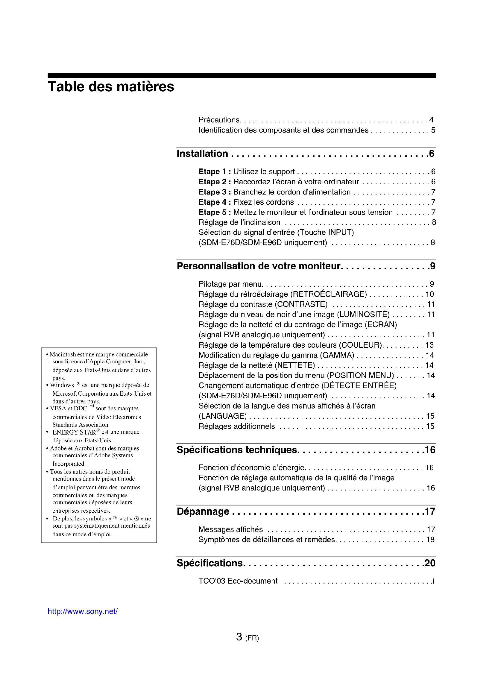 - De plus, les symboles « ™ » et « ® » ne sont pas systématiquement mentionnés dans ce mode d’emploi. http://www.sony.net/ 3 (FR) Précautions. . . . . . . . . . . . . . . . . . . . . . . . . . . . . . . . . . . . . . . . . . . . 4 Identification des composants et des commandes . . . . . . . . . . . . . . 5 Installation . . . . . . . . . . . . . . . . . . . . . . . . . . . . . . . . . . . . .6 Etape 1 : Utilisez le support . . . . . . . . . . . . . . . . . . . . . . . . . . . . . . . 6 Etape 2 : Raccordez l’écran à votre ordinateur . . . . . . . . . . . . . . . . 6 Etape 3 : Branchez le cordon d’alimentation . . . . . . . . . . . . . . . . . . 7 Etape 4 : Fixez les cordons . . . . . . . . . . . . . . . . . . . . . . . . . . . . . . . 7 Etape 5 : Mettez le moniteur et l’ordinateur sous tension . . . . . . . . 7 Réglage de l’inclinaison . . . . . . . . . . . . . . . . . . . . . . . . . . . . . . . . . . 8 Sélection du signal d’entrée (Touche INPUT) (SDM-E76D/SDM-E96D uniquement) . . . . . . . . . . . . . . . . . . . . . . . 8 Personnalisation de votre moniteur. . . . . . . . . . . . . . . . .9 Pilotage par menu. . . . . . . . . . . . . . . . . . . . . . . . . . . . . . . . . . . . . . . 9 Réglage du rétroéclairage (RETROÉCLAIRAGE) . . . . . . . . . . . . . 10 Réglage du contraste (CONTRASTE) . . . . . . . . . . . . . . . . . . . . . . 11 Réglage du niveau de noir d’une image (LUMINOSITÉ) . . . . . . . . 11 Réglage de la netteté et du centrage de l’image (ECRAN) (signal RVB analogique uniquement) . . . . . . . . . . . . . . . . . . . . . . . 11 Réglage de la température des couleurs (COULEUR). . . . . . . . . . 13 Modification du réglage du gamma (GAMMA) . . . . . . . . . . . . . . . . 14 Réglage de la netteté (NETTETE) . . . . . . . . . . . . . . . . . . . . . . . . . 14 Déplacement de la position du menu (POSITION MENU) . . . . . . . 14 Changement automatique d’entrée (DÉTECTE ENTRÉE) (SDM-E76D/SDM-E96D uniquement) . . . . . . . . . . . . . . . . . . . . . . 14 Sélection de la langue des menus affichés à l’écran (LANGUAGE) . . . . . . . . . . . . . . . . . . . . . . . . . . . . . . . . . . . . . . . . . 15 Réglages additionnels . . . . . . . . . . . . . . . . . . . . . . . . . . . . . . . . . . 15 Spécifications techniques. . . . . . . . . . . . . . . . . . . . . . . .16 Fonction d’économie d’énergie. . . . . . . . . . . . . . . . . . . . . . . . . . . . 16 Fonction de réglage automatique de la qualité de l’image (signal RVB analogique uniquement) . . . . . . . . . . . . . . . . . . . . . . . 16 Dépannage . . . . . . . . . . . . . . . . . . . . . . . . . . . . . . . . . . . .17 Messages affichés . . . . . . . . . . . . . . . . . . . . . . . . . . . . . . . . . . . . . 17 Symptômes de défaillances et remèdes. . . . . . . . . . . . . . . . . . . . . 18 Spécifications. . . . . . . . . . . . . . . . . . . . . . . . . . . . . . . . . .20 TCO’03 Eco-document . . . . . . . . . . . . . . . . . . . . . . . . . . . . . . . . . . .i4 (FR) Précautions Avertissement sur les connexions d’alimentation