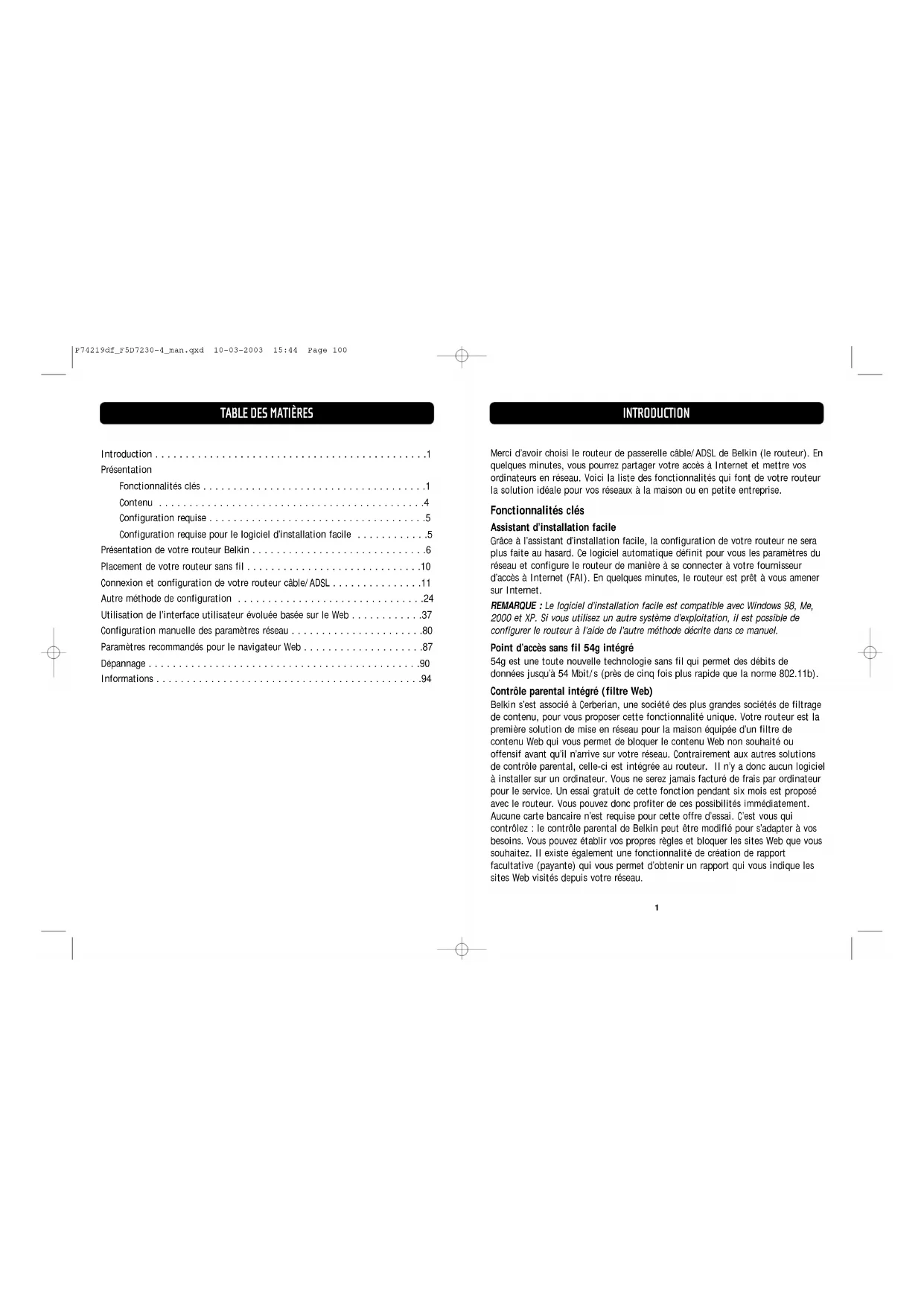 Beperkte levenslange productgarantie door Belkin Corporation Belkin Corporation garandeert dit product gedurende zijn gehele levensduur voor wat betreft materialen en fabricage. Als een defect aan het licht komt, zal Belkin het product naar eigen goeddunken kosteloos repareren of vervangen mits het product binnen de garantieperiode portvrij wordt geretourneerd aan de erkende Belkin dealer van wie u het product hebt gekocht. Het vertonen van een aankoopbewijs kan worden verlangd. Deze garantie geldt niet indien het product is beschadigd door een ongeval, door opzettelijk of onopzettelijk misbruik en/of door onjuiste toepassing hetzij door wijziging van het product zonder uitdrukkelijke schriftelijke toestemming van Belkin dan wel door verwijdering of verminking van een Belkin serienummer. DE BOVENGENOEMDE GARANTIE EN MAATREGELEN SLUITEN ALLE ANDERE UIT, MONDELING DAN WEL SCHRIFTELIJK, UITDRUKKELIJK OF IMPLICIET. BELKIN VERWERPT MET NAME ELKE EN ALLE IMPLICIETE GARANTIE(S), ONVERKORT MEEGEREKEND GARANTIES INZAKE COMMERCIËLE TOEPASSINGEN EN/OF GESCHIKTHEID VOOR EEN BIJZONDER DOEL. Geen door Belkin aangestelde of namens Belkin handelende wederverkoper, tussenpersoon of werknemer is gemachtigd deze garantie op welke wijze dan ook te wijzigen, uit te breiden of aan te vullen. BELKIN IS NIET AANSPRAKELIJK VOOR BIJZONDERE, BIJKOMENDE OF VERVOLGSCHADE ONTSTAAN DOOR GARANTIEVERBREKING VAN WELKE AARD OOK OF UIT HOOFDE VAN ENIG ANDER JURIDISCH BEGINSEL, MET INBEGRIP VAN MAAR NIET BEPERKT TOT BEDRIJFSSTILSTAND, VERLIES VAN WINST OF GOODWILL, BESCHADIGING HETZIJ HERPROGRAMMERING OF REPRODUCTIE VAN ENIG PROGRAMMA OF VAN DATA OPGESLAGEN IN OF GEBRUIKT IN SAMENHANG MET BELKIN PRODUCTEN. Sommige staten verbieden de uitsluiting of beperking van incidentele of vervolgschade of de uitsluiting van impliciete garanties in welk geval de hierboven vermelde beperkingen of uitsluitingen wellicht niet op u van toepassing zijn. Deze garantie verleent u specifieke wettelijke rechten en wellicht hebt u andere rechten die van staat tot staat verschillen. P74219df_F5D7230-4_man.qxd 10-03-2003 15:44 Page 96Manuel de l’utilisateur F5D7230-4 Routeur câble/ADSL sans fil Partagez votre accès Internet à haut débit ainsi que vos fichiers Belkin Corporation501 West Walnut StreetCompton • CA • 90220 • USATel: 310.898.1100Fax: 310.898.1111Belkin Components, Ltd.Express Business ParkShipton Way • Rushden • NN10 6GLVerenigd KoninkrijkTel: +44 (0) 1933 35 2000Fax: +44 (0) 1933 31 2000Belkin Components B.V.Starparc Building • Boeing Avenue 3331119 PH Schiphol-Rijk • NederlandTel: +31 (0) 20 654 7300Fax: +31 (0) 20 654 7349Belkin GmbHHanebergstrasse 2 •D-80637 München • DuitslandTel: +49 (0) 89 143 4050Fax: +49 (0) 89 143 405100Belkin, Ltd.7 Bowen Crescent • West GosfordNSW 2250 • AustraliëTel: +61 (0) 2 4372 8600Fax: +61 (0) 2 4372 8603Belkin technische helpdeskUSA: 310.898.1100 toestel 2263800.223.5546 toestel 2263Europa: 00 800 223 55 460Australien: 1800 666 040 P74219 © 2003 Belkin Corporation. Alle rechten voorbehouden. Alle handelsnamen zijn gedeponeerde handelsmerken van de betreffende rechthebbenden.belkin.com P74219df_F5D7230-4_man.qxd 10-03-2003 15:44 Page 981 INTRODUCTION Merci d’avoir choisi le routeur de passerelle câble/ADSL de Belkin (le routeur). En quelques minutes, vous pourrez partager votre accès à Internet et mettre vos ordinateurs en réseau. Voici la liste des fonctionnalités qui font de votre routeur la solution idéale pour vos réseaux à la maison ou en petite entreprise. Fonctionnalités clés Assistant d’installation facile Grâce à l’assistant d’installation facile, la configuration de votre routeur ne sera plus faite au hasard. Ce logiciel automatique définit pour vous les paramètres du réseau et configure le routeur de manière à se connecter à votre fournisseur d’accès à Internet (FAI). En quelques minutes, le routeur est prêt à vous amener sur Internet. REMARQUE : Le logiciel d’installation facile est compatible avec Windows 98, Me, 2000 et XP. Si vous utilisez un autre système d’exploitation, il est possible de configurer le routeur à l’aide de l’autre méthode décrite dans ce manuel. Point d’accès sans fil 54g intégré 54g est une toute nouvelle technologie sans fil qui permet des débits de données jusqu’à 54 Mbit/s (près de cinq fois plus rapide que la norme 802.11b). Contrôle parental intégré (filtre Web) Belkin s’est associé à Cerberian, une société des plus grandes sociétés de filtrage de contenu, pour vous proposer cette fonctionnalité unique. Votre routeur est la première solution de mise en réseau pour la maison équipée d’un filtre de contenu Web qui vous permet de bloquer le contenu Web non souhaité ou offensif avant qu’il n’arrive sur votre réseau. Contrairement aux autres solutions de contrôle parental, celle-ci est intégrée au routeur. Il n’y a donc aucun logiciel à installer sur un ordinateur. Vous ne serez jamais facturé de frais par ordinateur pour le service. Un essai gratuit de cette fonction pendant six mois est proposé avec le routeur. Vous pouvez donc profiter de ces possibilités immédiatement. Aucune carte bancaire n’est requise pour cette offre d’essai. C’est vous qui contrôlez : le contrôle parental de Belkin peut être modifié pour s’adapter à vos besoins. Vous pouvez établir vos propres règles et bloquer les sites Web que vous souhaitez. Il existe également une fonctionnalité de création de rapport facultative (payante) qui vous permet d’obtenir un rapport qui vous indique les sites Web visités depuis votre réseau.